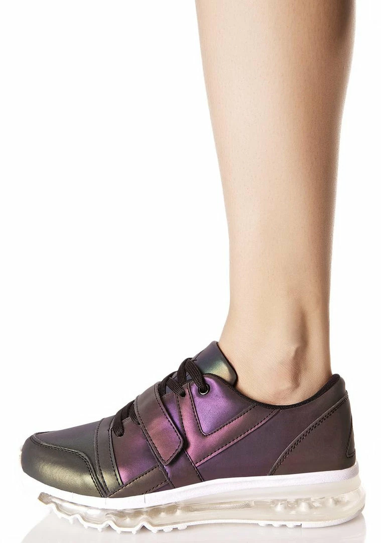 are gunna cause a frenzy on tha dancefloor, bb! These dope sneakers feature an iridescent oil slick construction that shines ultra bright under flashing lights, bubble platform sole, padded interior, velcro strap across the top, and lace-ups.