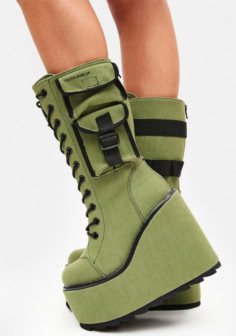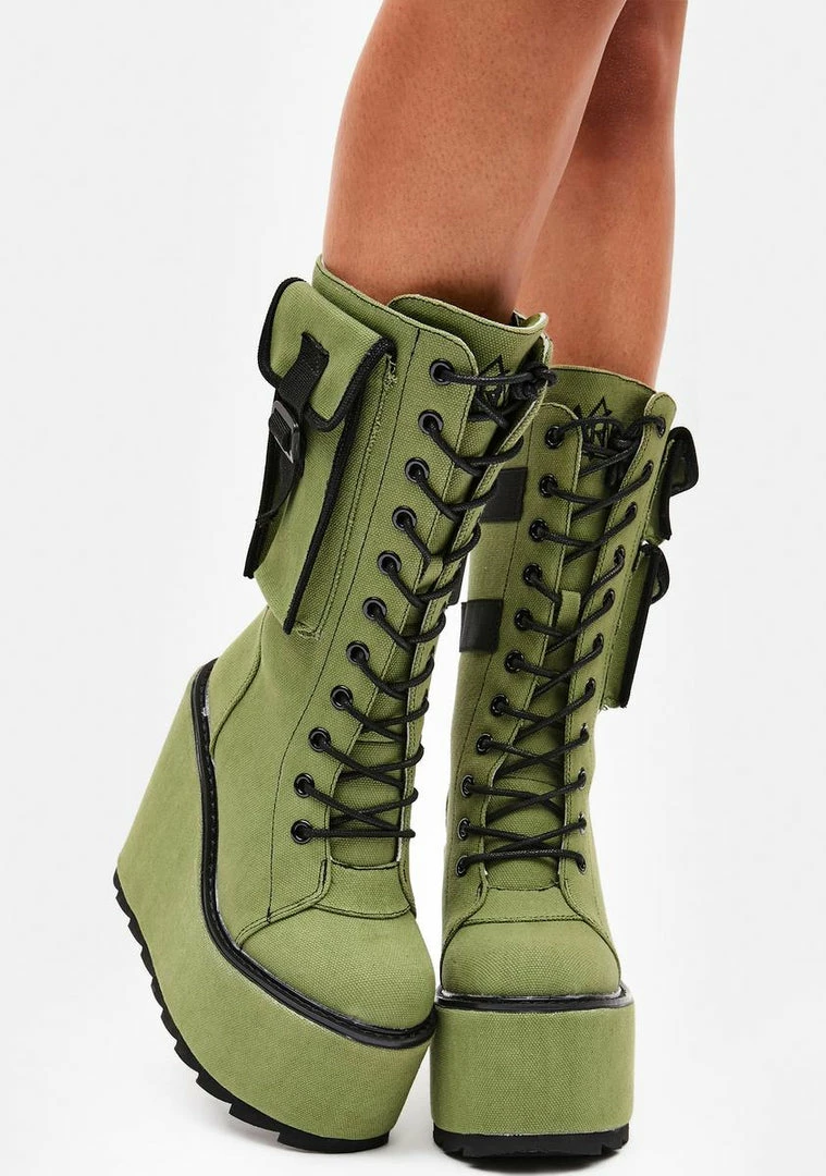 cuz you take a step in the right direction. These lace-up platform boots have a canvas material, pockets on the sides, and back zip closures.