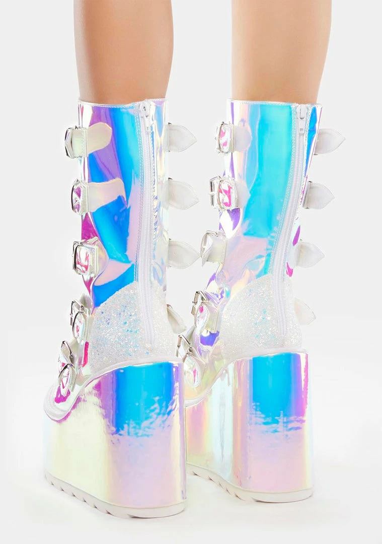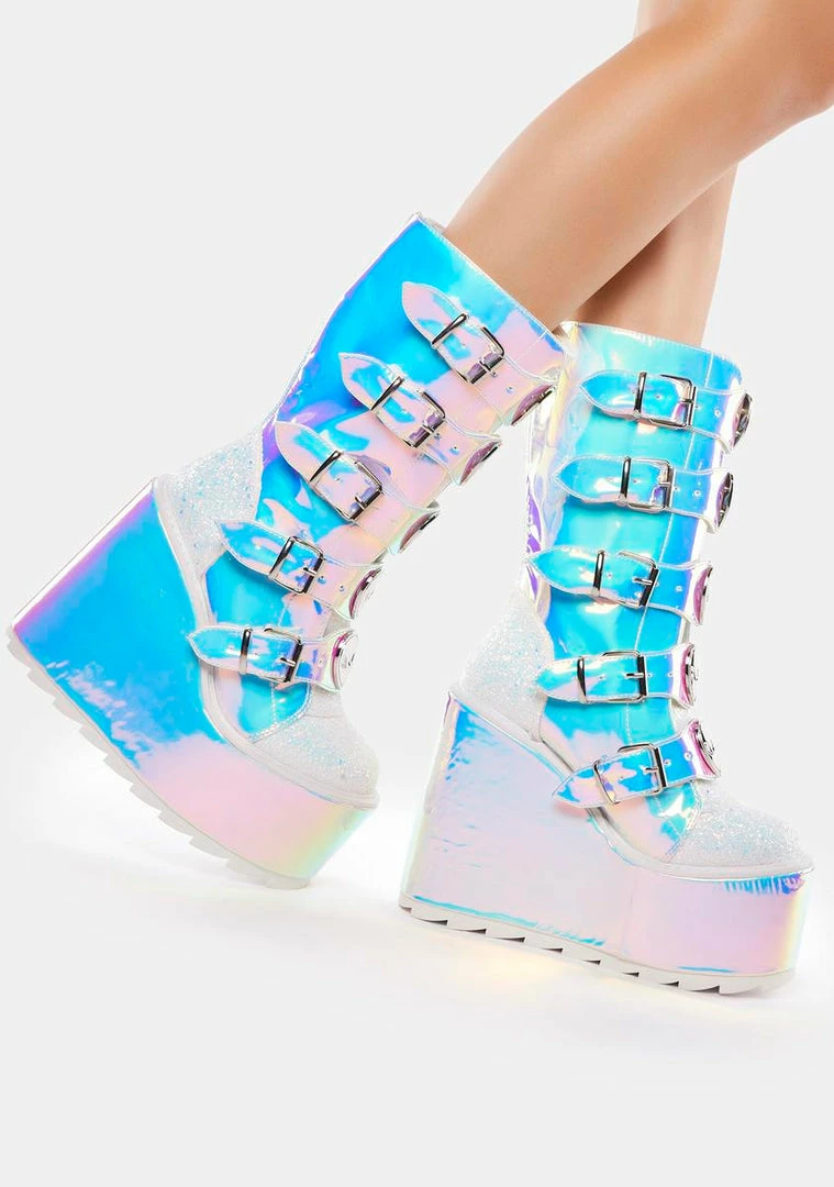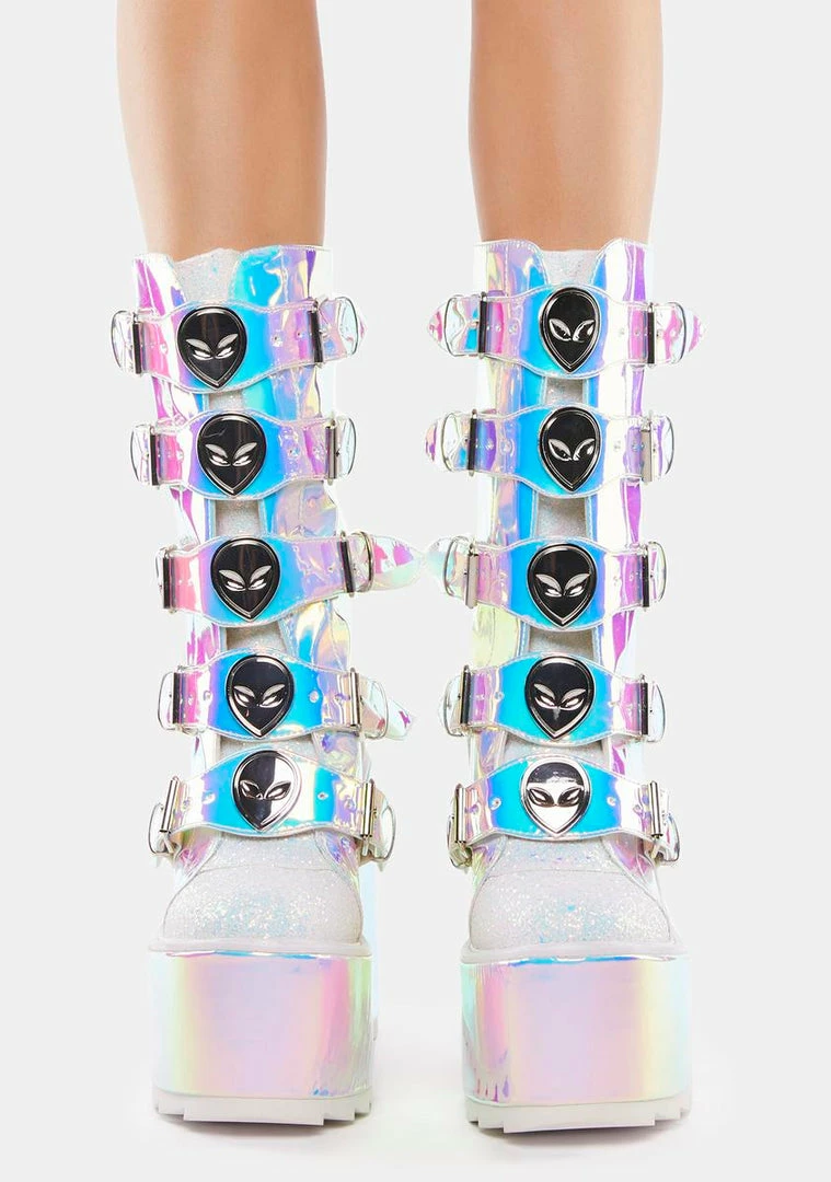 cuz planet earth is boring! These calf-high boots have a blue iridescent construction with contrast glitter trim, wedge platform soles, adjustable buckle straps on the front with alien enamel hardware, and back zip closures.
