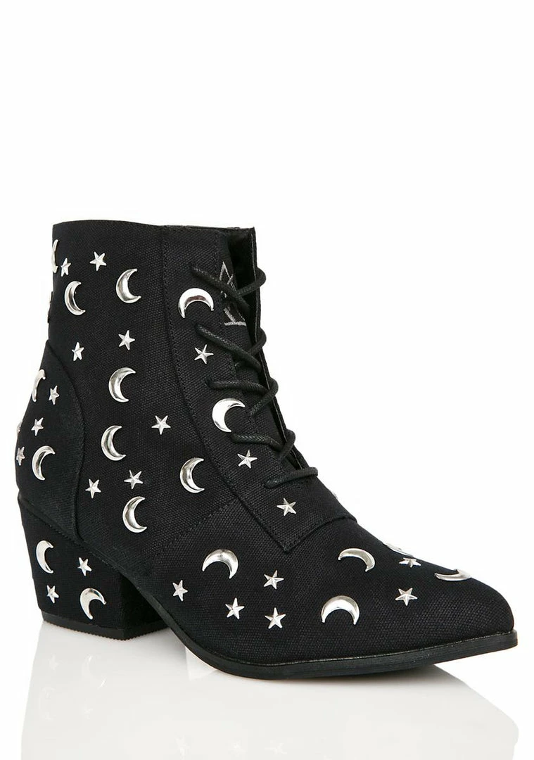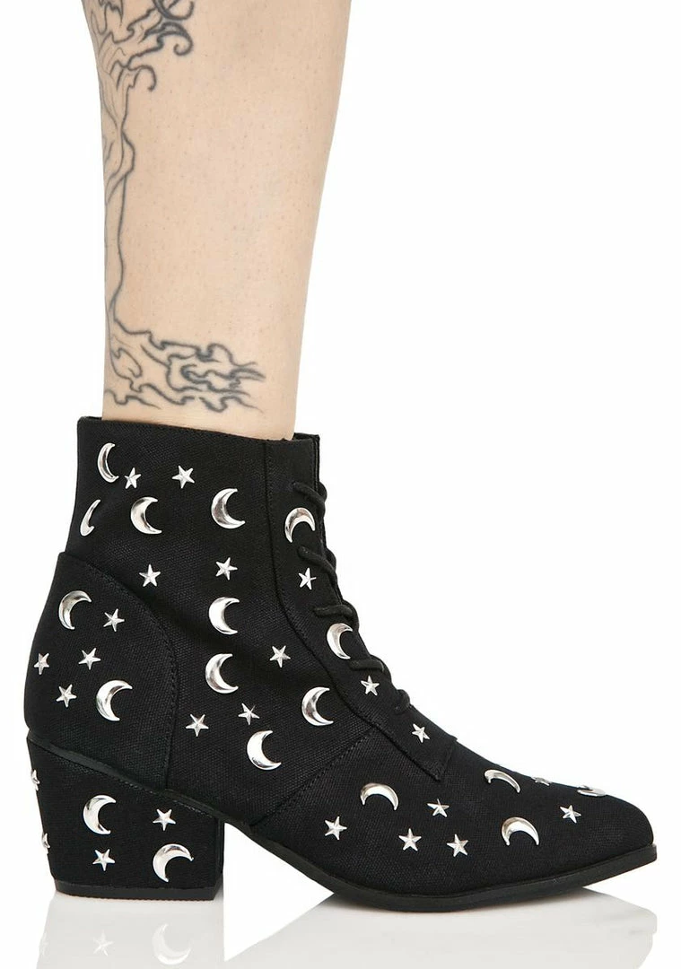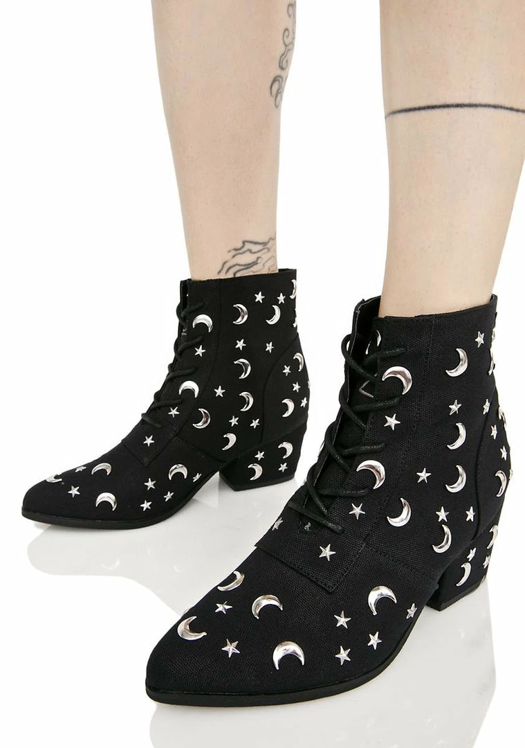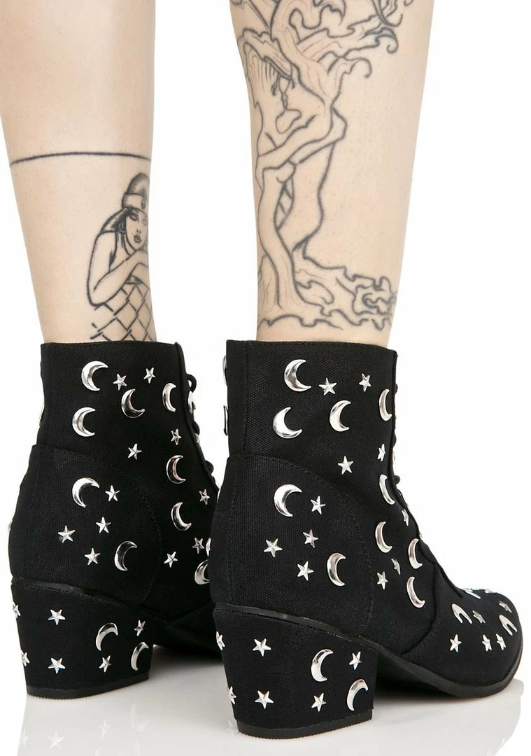 cuz the moon and the stars shine just fer yew, babe. Get some space in these booties that feature a black canvas construction, black lace-up front, and silver moons and stars all over.