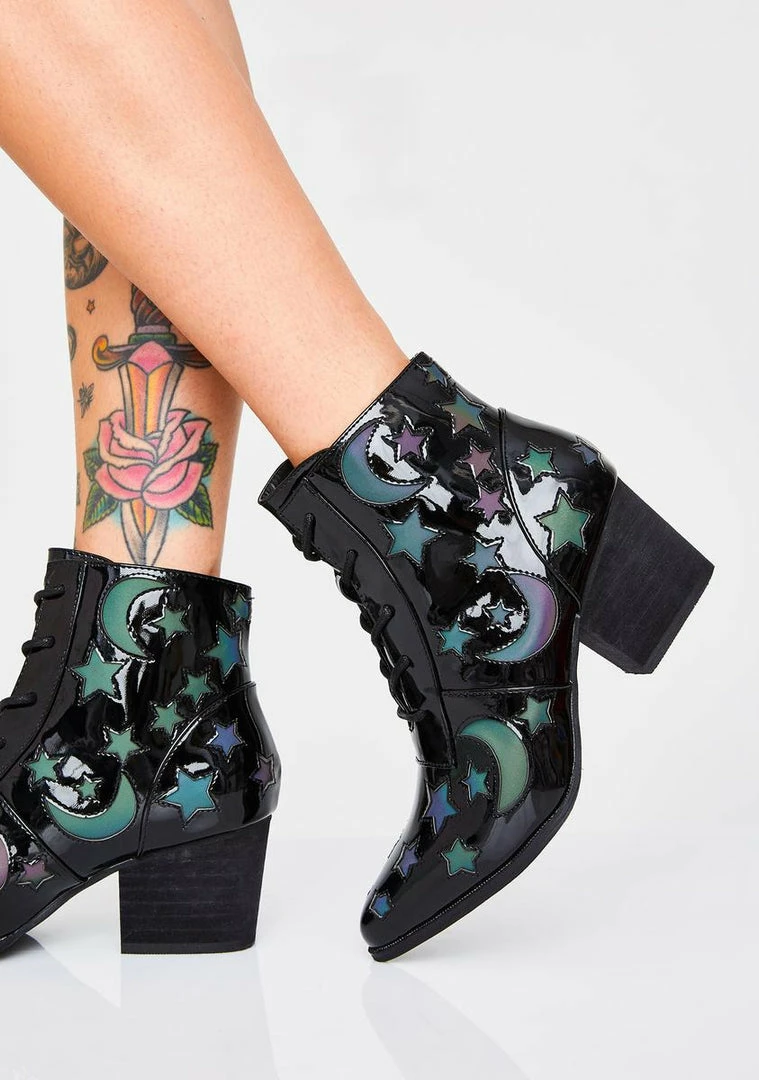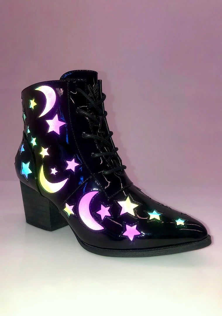 light up the sky, babe. Have ’em wishin’ on a star in these dope AF ankle boots that have reflective moons N’ stars, pointed toes, and supa sleek material.