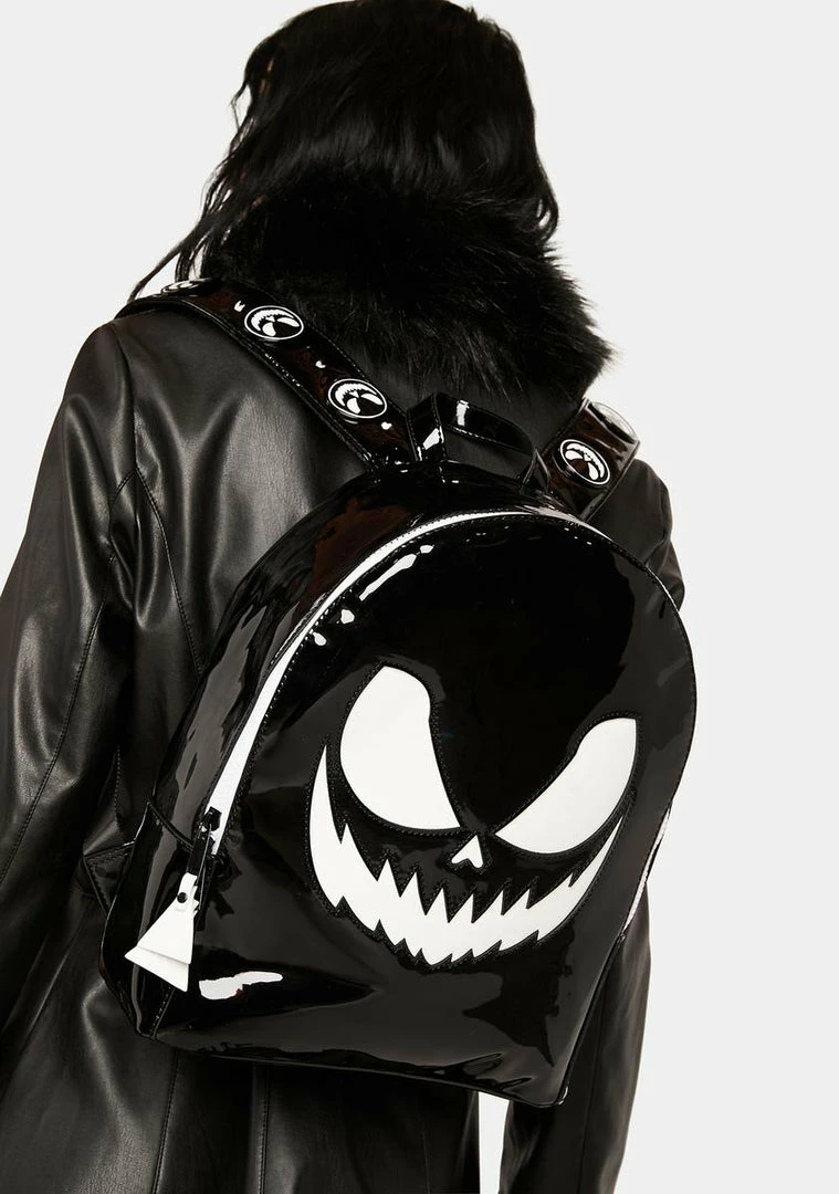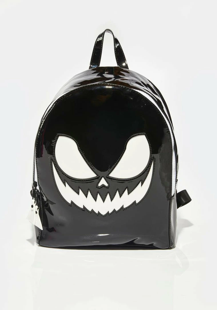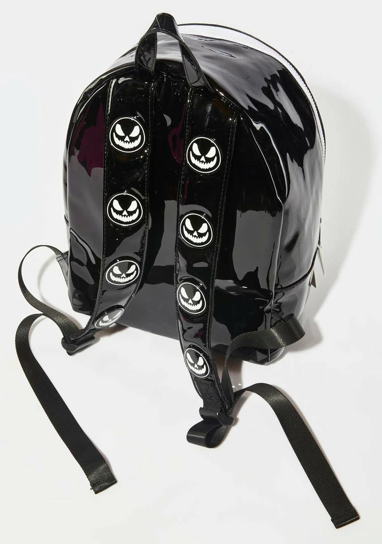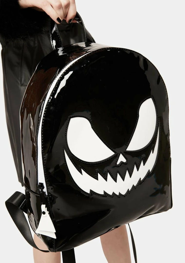cuz it’s spooky time all year round. This backpack has a patent vinyl construction, adjustable shoulder straps, graphic skulls on the straps, a smiling skull graphic on the front, and a top zip closure.