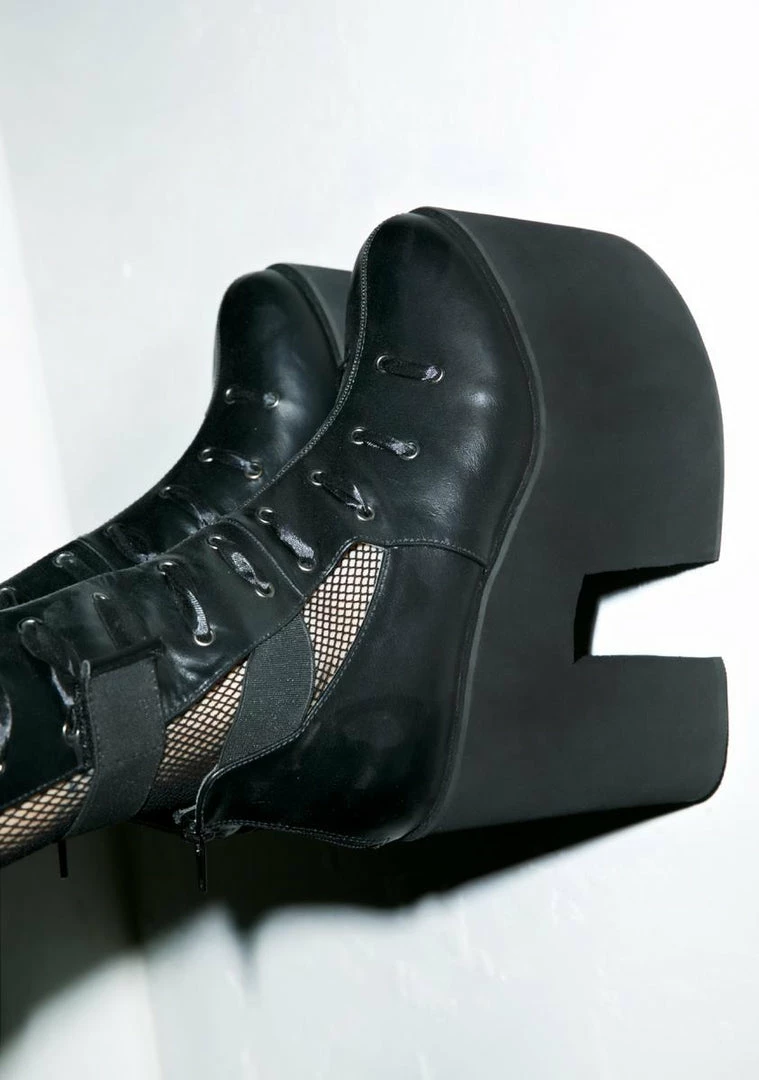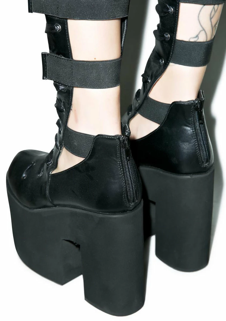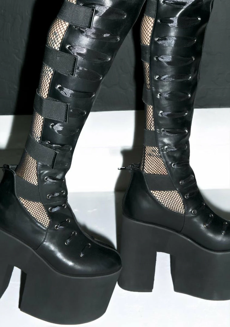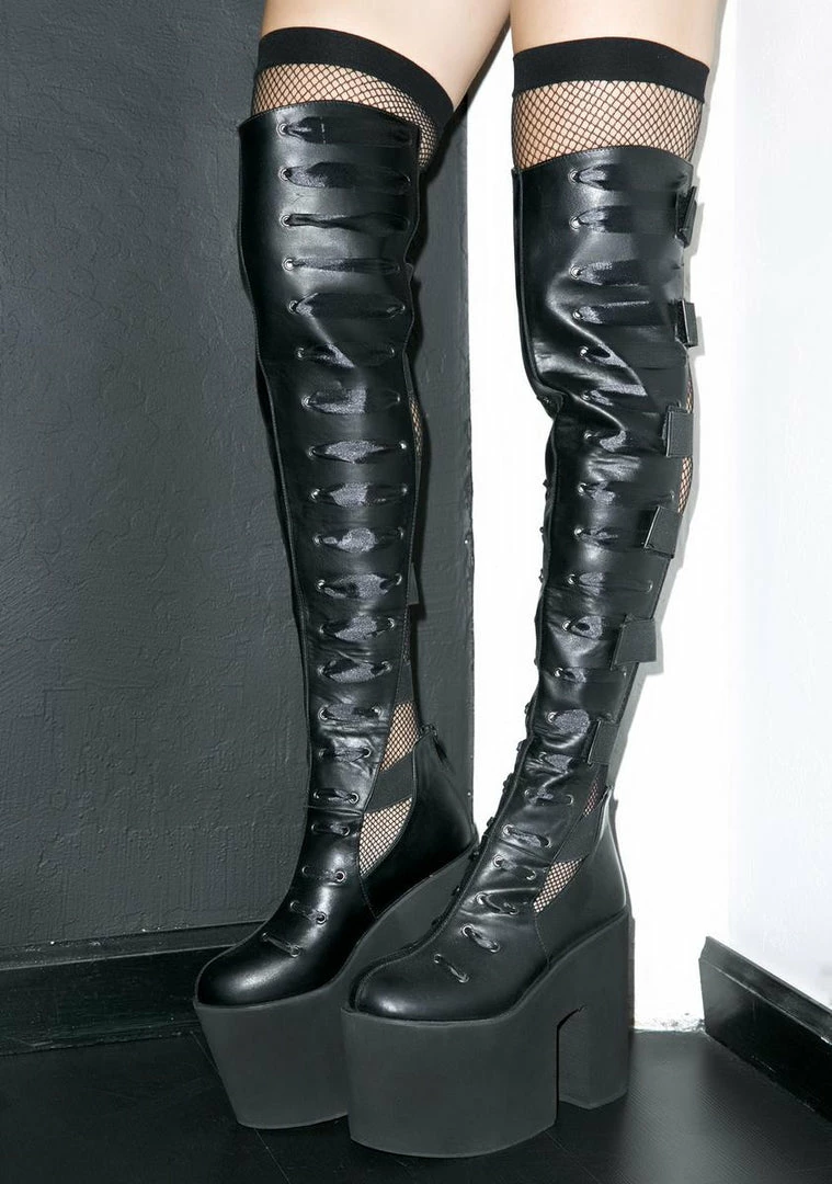 will have ya feeling like going intergalactic. These epic over-the-knee boots are constructed from soft vegan leather with a solid, almost shield like front and open back with multiple rows of velcro straps. Complete yer dark space princess vibe with extreme yet lightweight platforms and heels with back zipper closure.