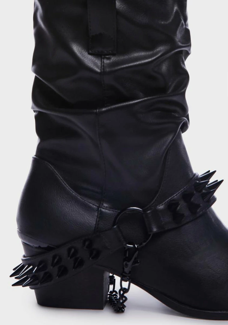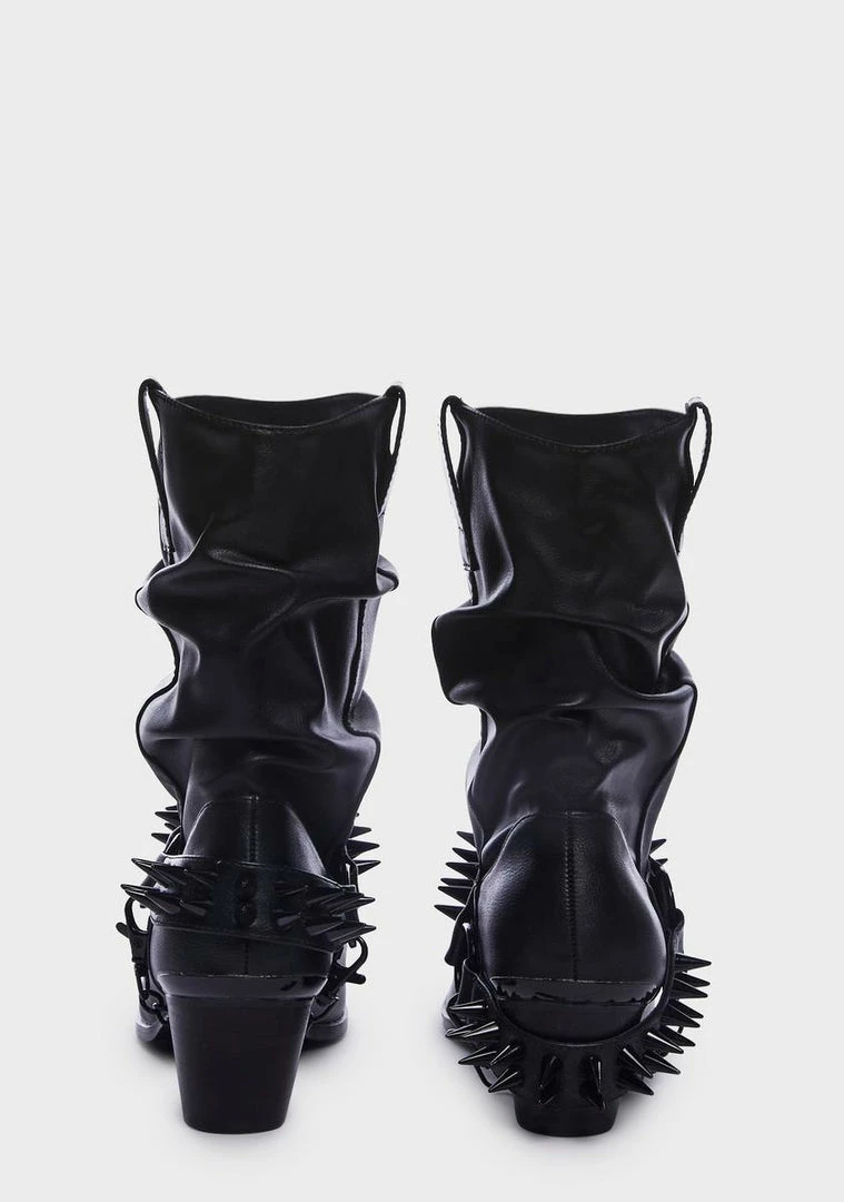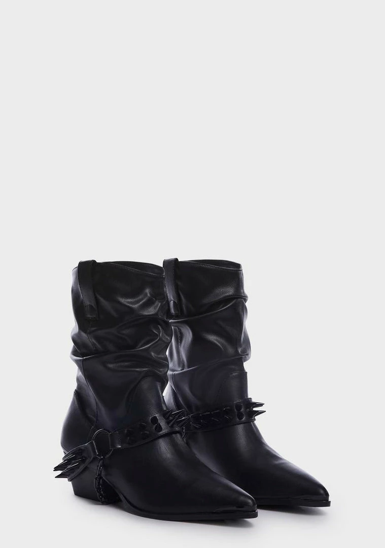 in matte vegan leather with slouchy construction. Detachable spiked harness straps, chunky heels, and pointed toes.