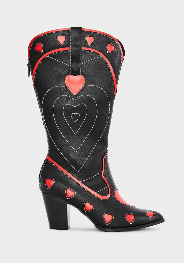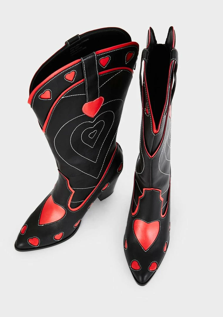 get galactic, babe! Take รขยยem to the disco desert in these stitched vegan leather cowboy boots that have chunky block heels, pointed toes, back zip closures and too cute heart designs all ova.