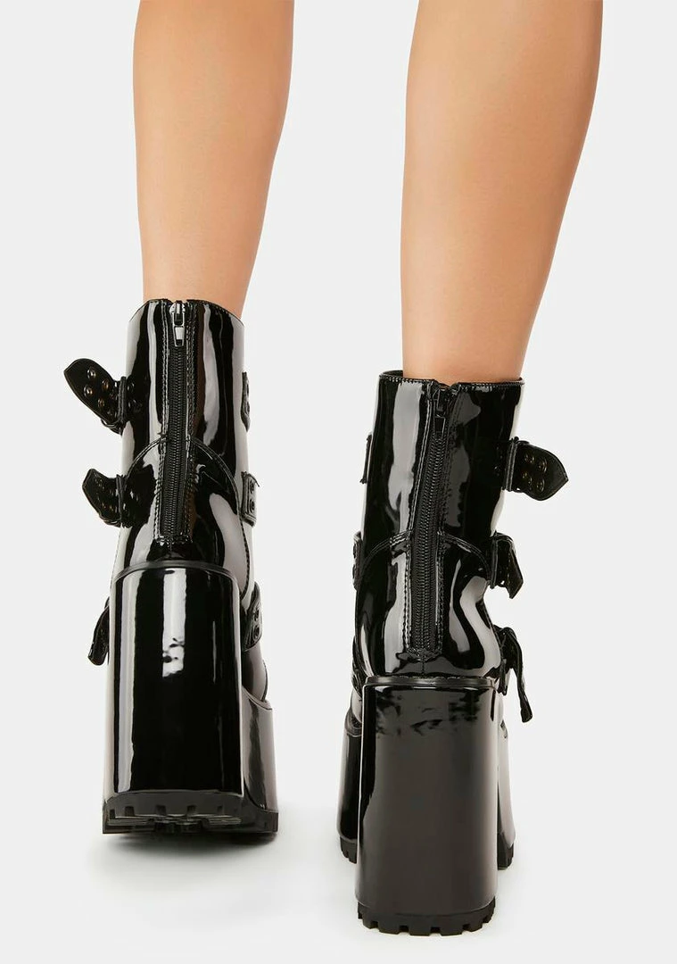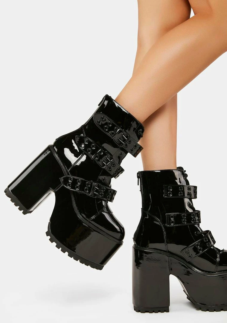 take ’em down to the underground. These mid-height ankle boots have a patent vegan leather construction, chunky platforms with block heels, adjustable laces, tonal black buckle straps with double grommet hardware, and back zip closures.