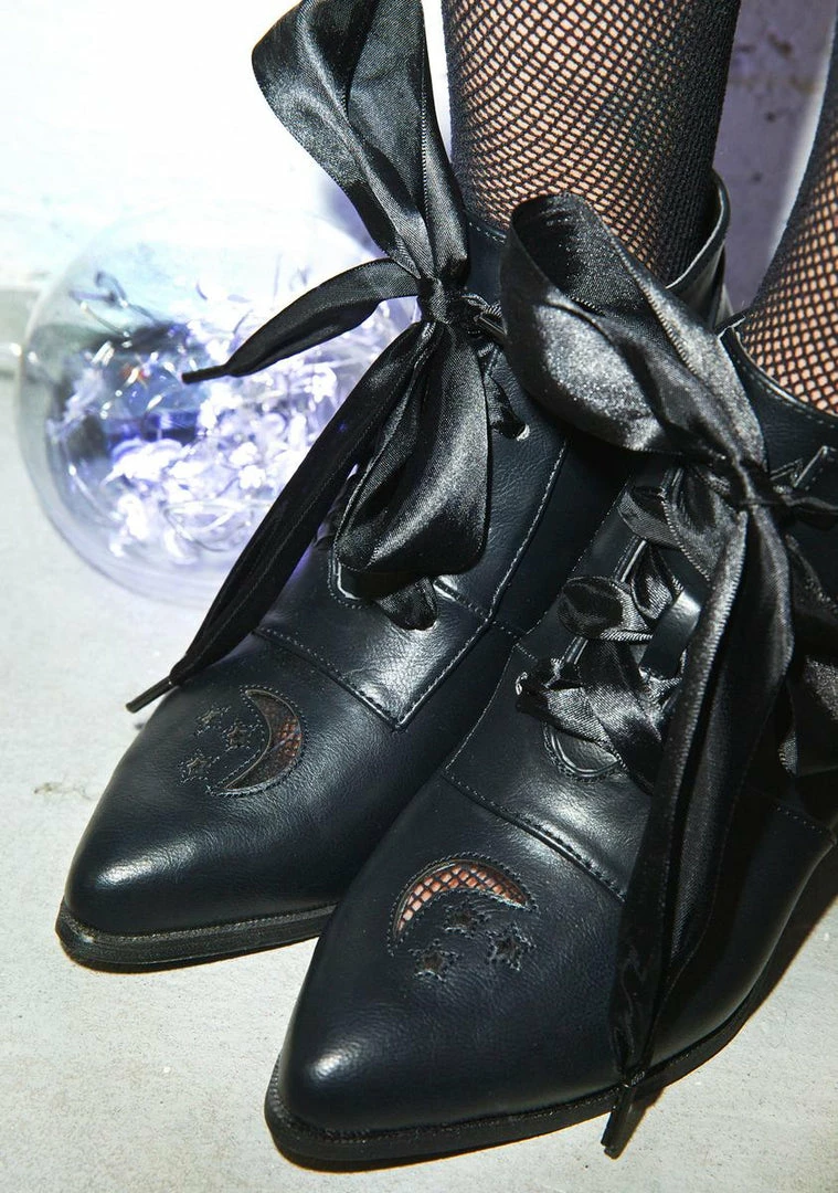 yer aura radiates at a high frequency bb. These gorgeous ankle boots are covered in supa smooth NΓ’ΒΒ soft vegan leather with 2 ΓΒΌΓ’ΒΒ inch stacked wooden heels. FeaturinΓ’ΒΒ a stunning star and moon cut-out at yer toes with clear vinyl overlay so we can see all the way through yer aura. With front satin lace closure these flattering ankle boots will have ya feeling magical.