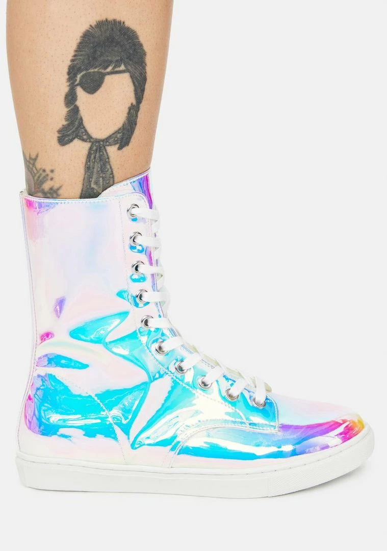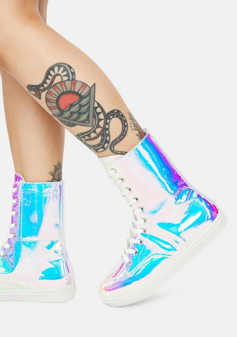 have inner credit card and ID slots, adjustable lace-up closures, and an iridescent material.