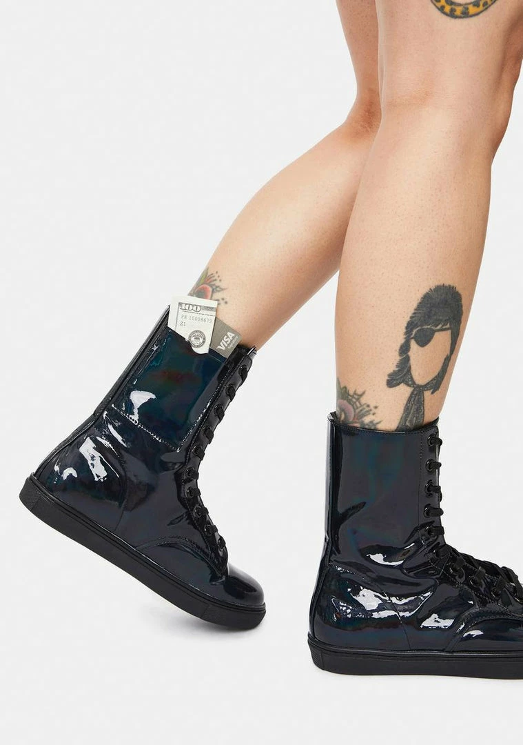 have inner credit card and ID slots, adjustable lace-up closures, and a black holographic material.