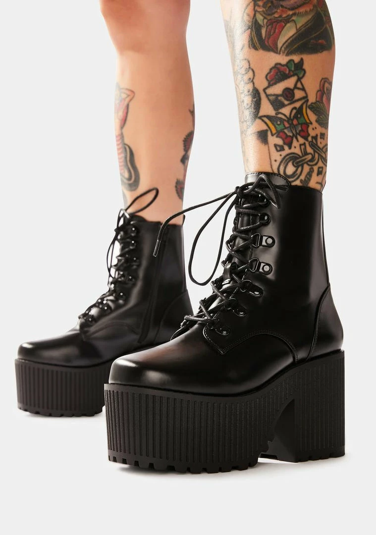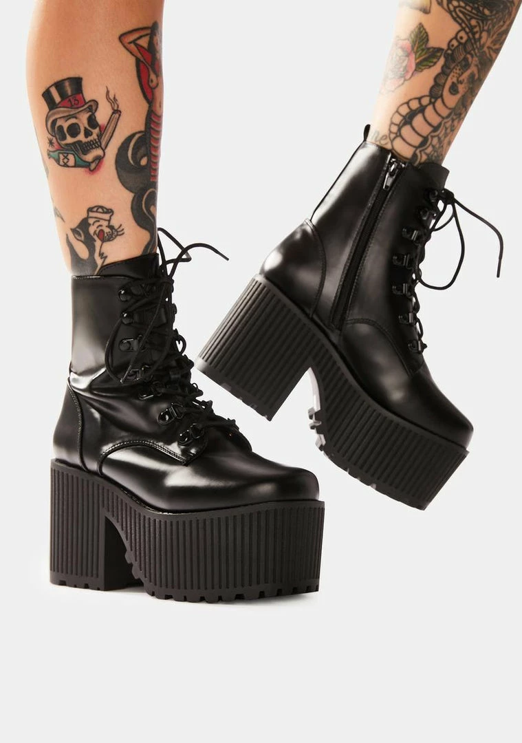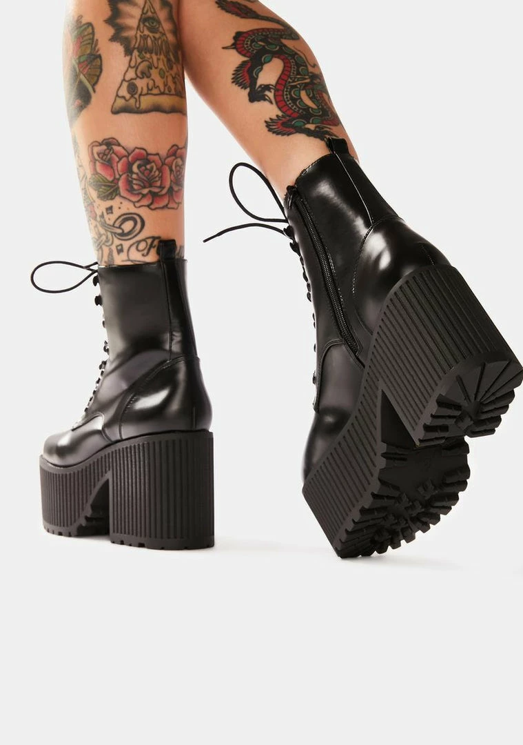 cuz youΓ’ΒΒre a nightcrawler. These platform boots have a vegan leather upper construction, adjustable D-ring lace-ups, side zip closures, and heeled platform soles with a creeper design.