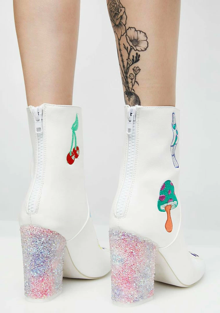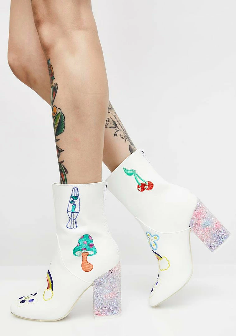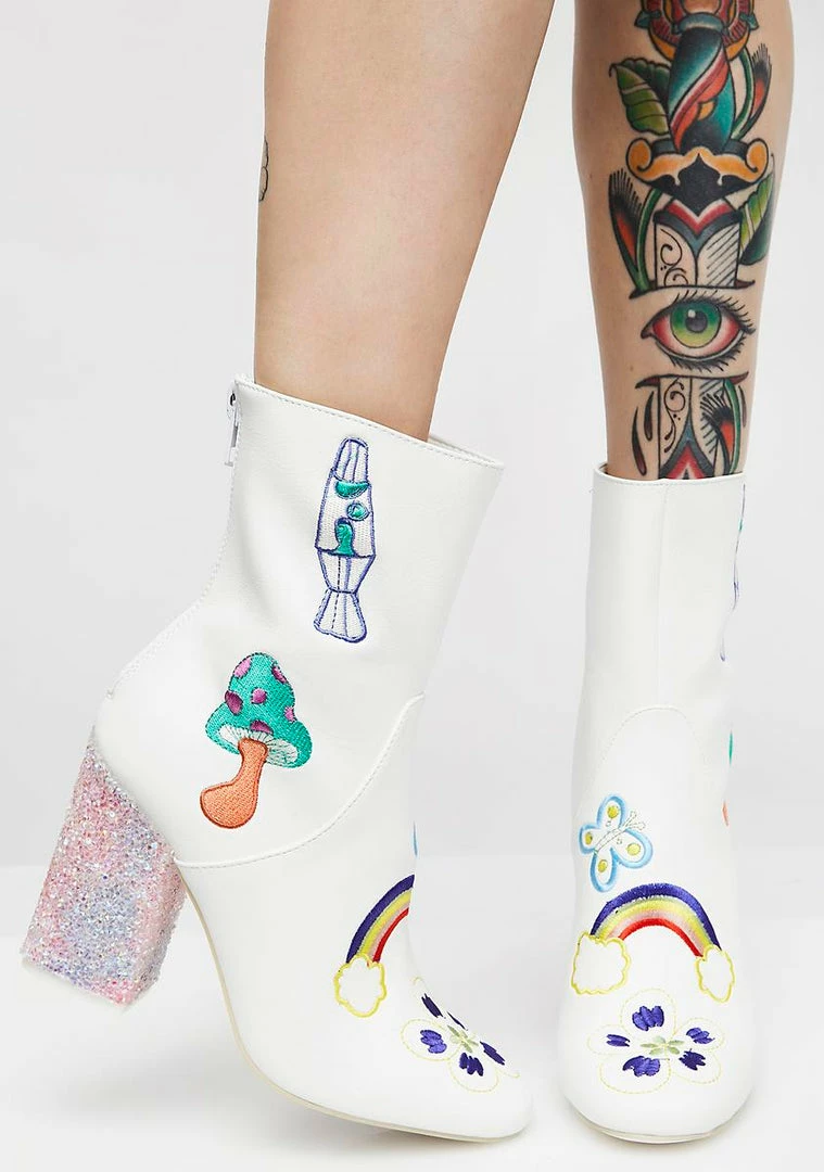 âcuz youâre a tripped out bae. Keep it funky in these festival booties that have embroidered deets, back zip closures, and chunky crystal glitter heels.