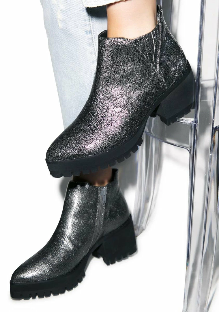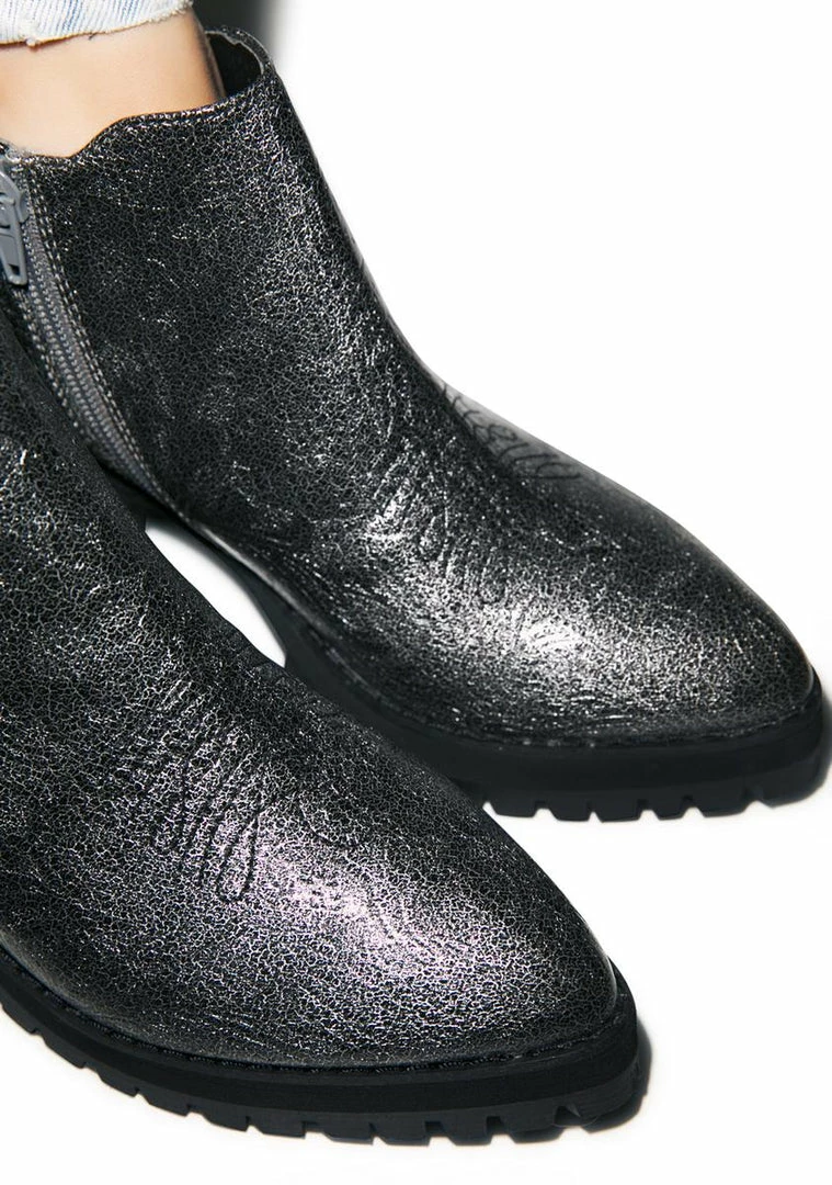 Y.R.U. Metallic Wolf Boots cry wolf fer attention. These sik kicks feature an all over metallic texture that will keep hearts skippinΓΒ with yer every step. No need for buckles or laces, these awesome boots keep it real straightforward. Zip ΓΒem up on the side or slip them on, ez and hassle free. Stomp around any field in perrrrfection with its contrast heel and teeth-textured soles. Have everybodyhowwwlinΓΒ at ya with thome serious shoe envry.