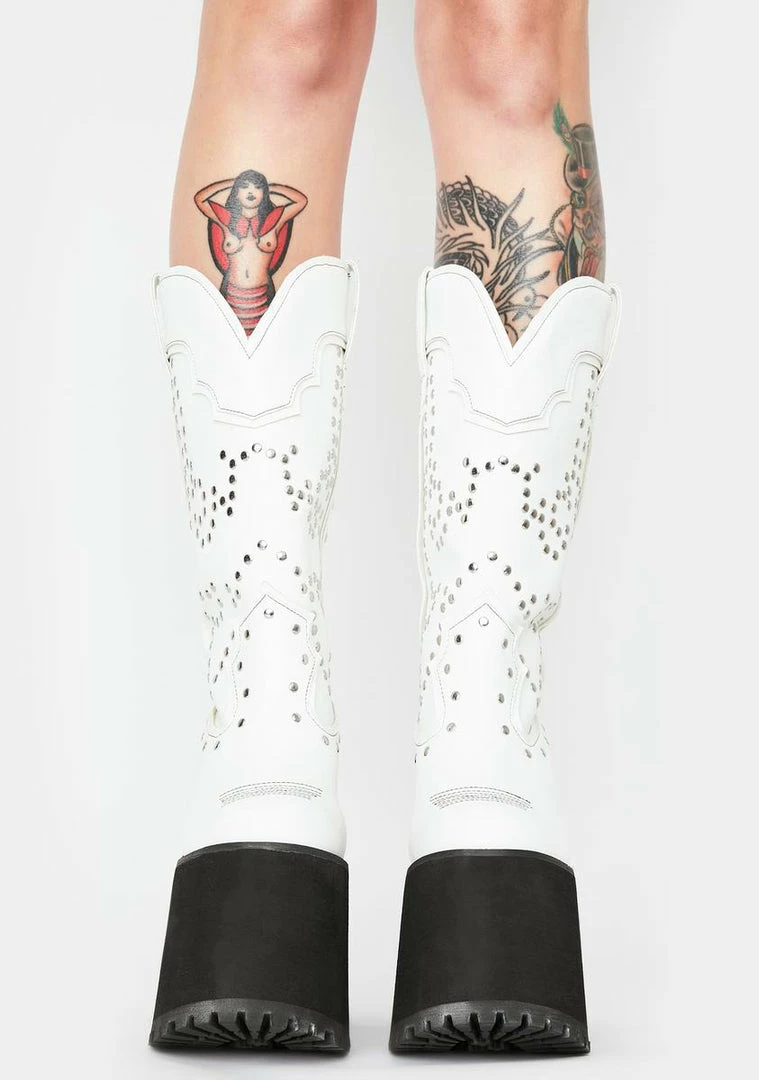 cuz they betta not wear your name out! Youรขยยll always be remembered in these exXxtra high platform cowboy boots that have a vegan leather construction, chunky block heels, western embroidered details Nรขยย studded hardware trim.