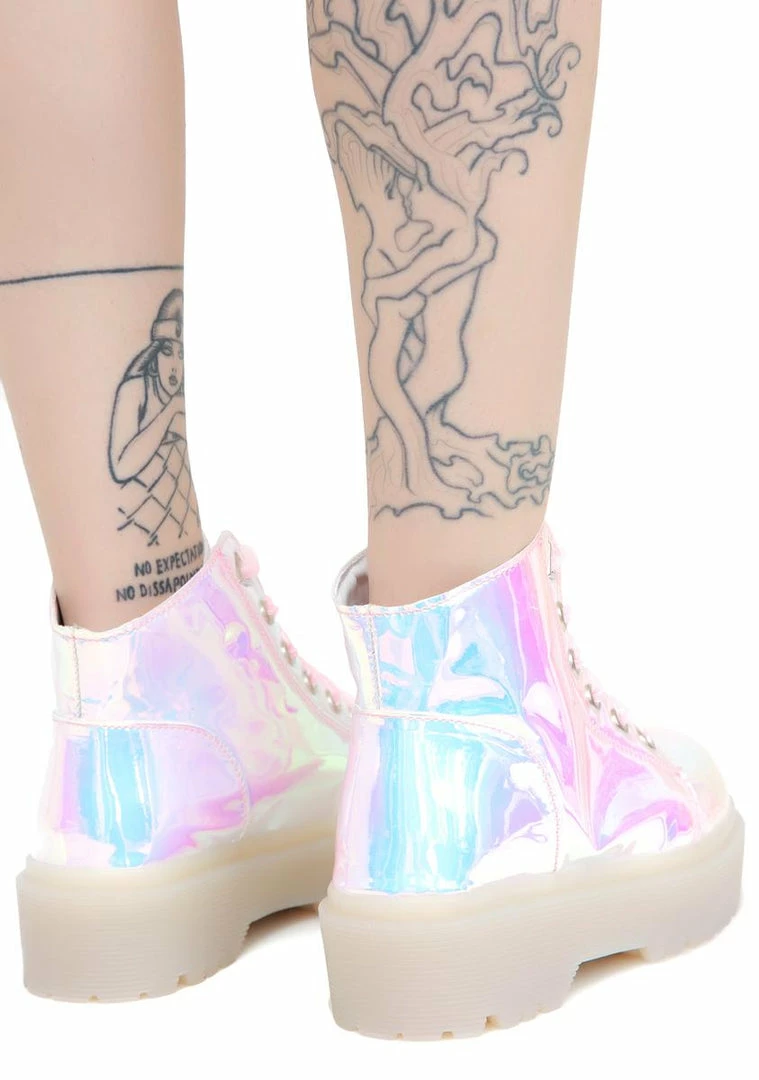 for all those mythic adventurers…reach new dimensions in these shiny af boots with supa shiny holographic uppers, chunky soles and lace-ups.