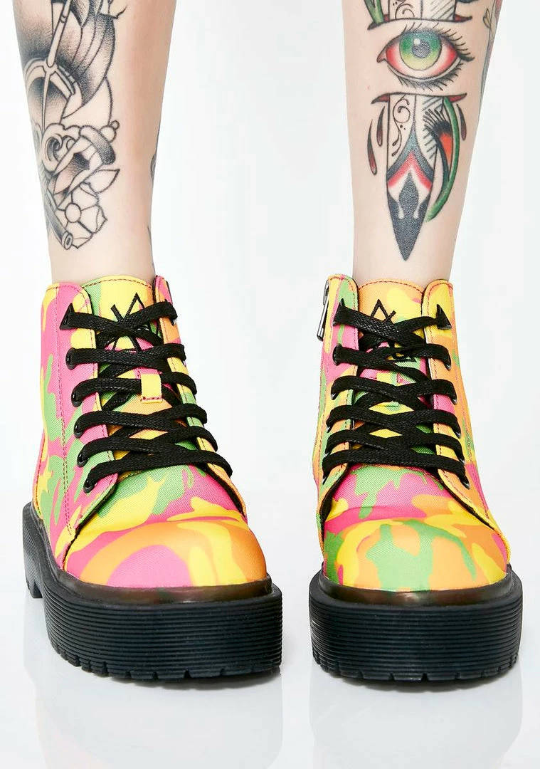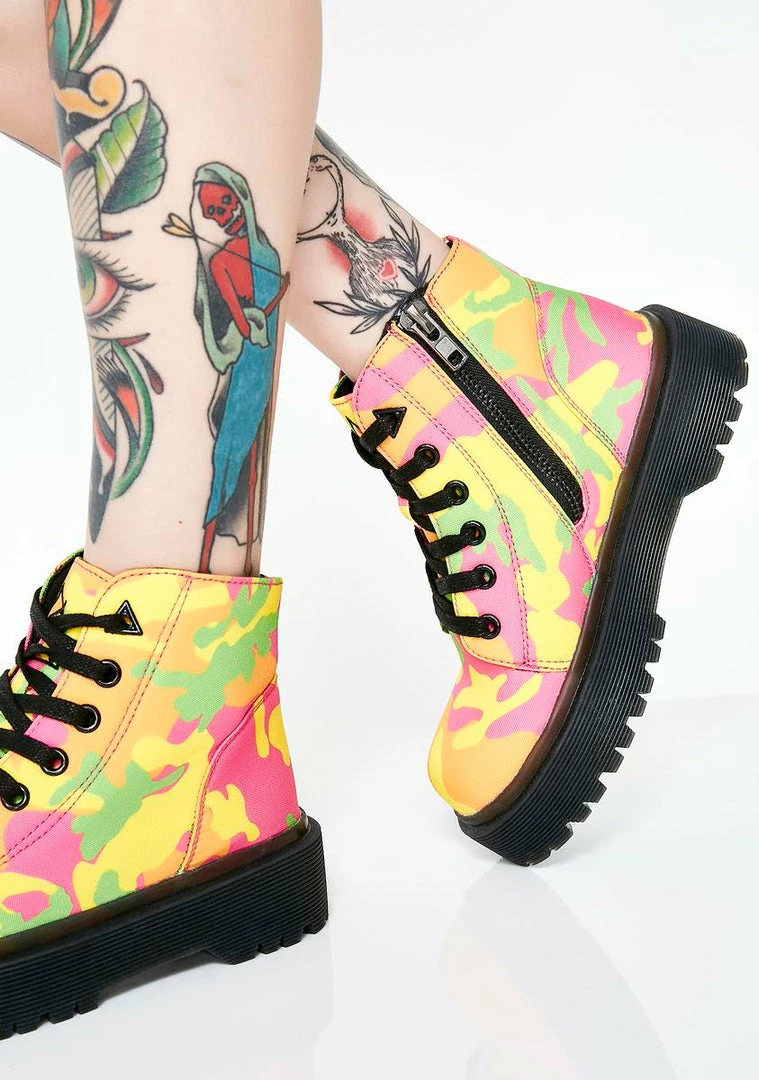 has ya stompinΓ’ΒΒ in straight steeze. Run the neon scene in these savage AF camo platform boots that lace up the front and have thicc rugged soles.
