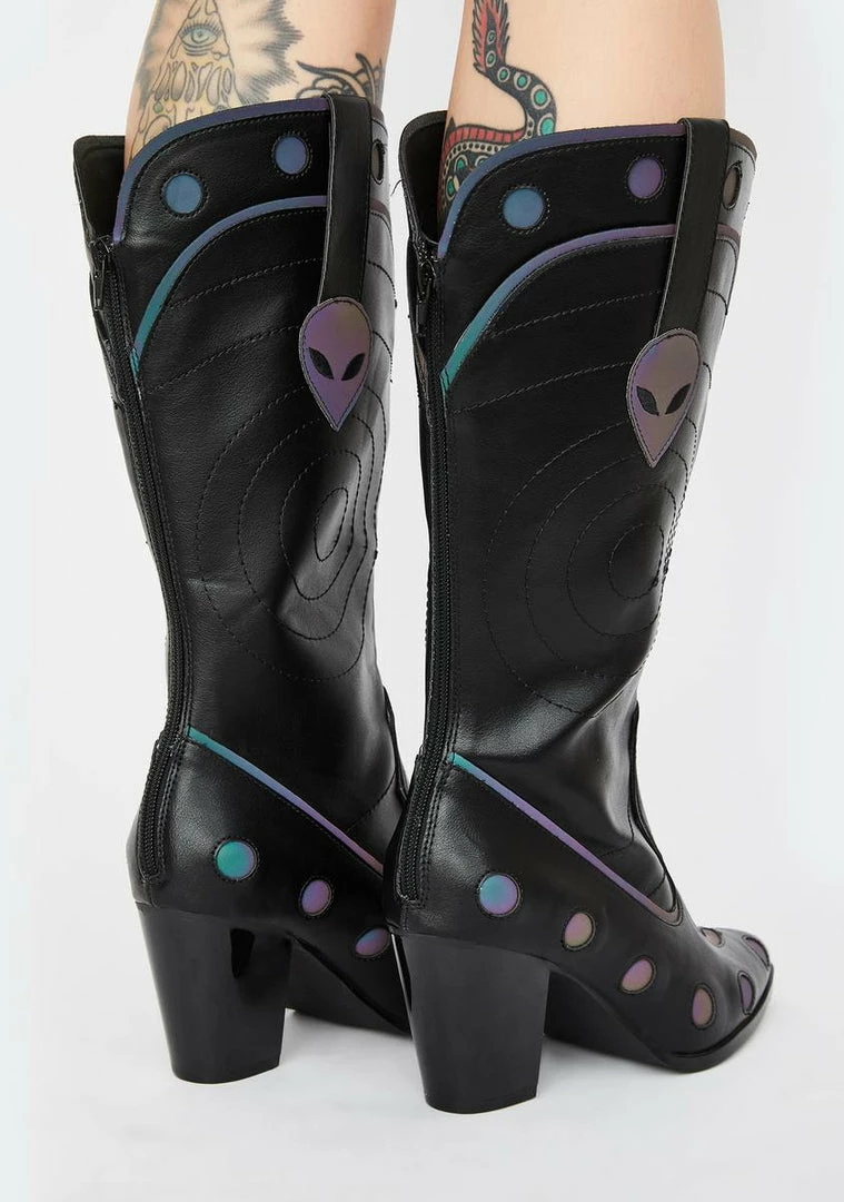 get galactic, babe! Take âem to the disco desert in these stitched vegan leather cowboy boots that have chunky block heels, pointed toes, back zip closures Nâ reflective trim with alien designs.