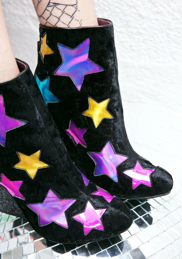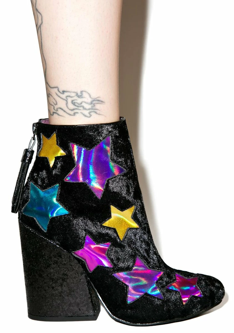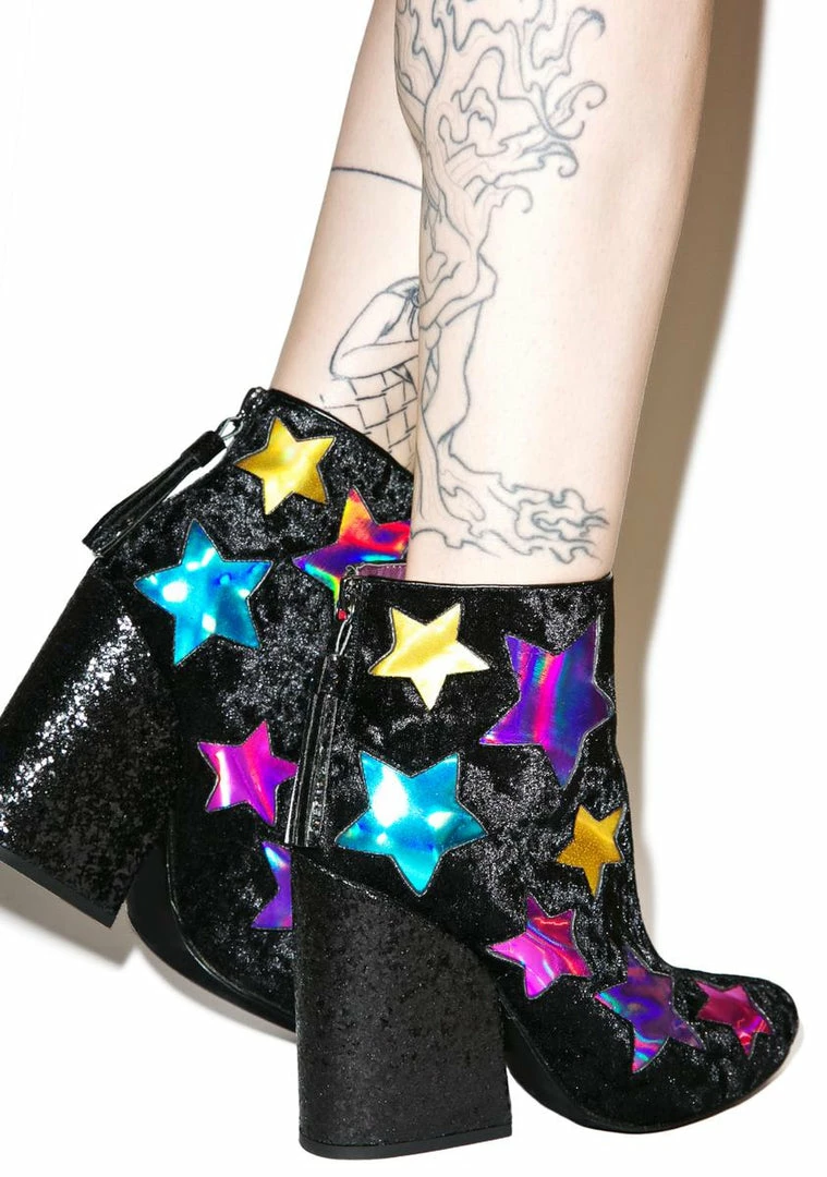 look like they have crashed down to earth from the heavens above. These starstruck stunners are covered in black velvet with fabulous all over multicolored hologram stars and feature chunky 4 1/2″ black glitter covered heels with back zipper closure and fringe tassel pulls.