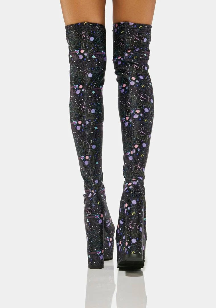 cuz you keep it cute! These stretch thigh high boots have platform soles with chunky block heels, rubber treaded soles, and a cosmic Care Bears print all over.