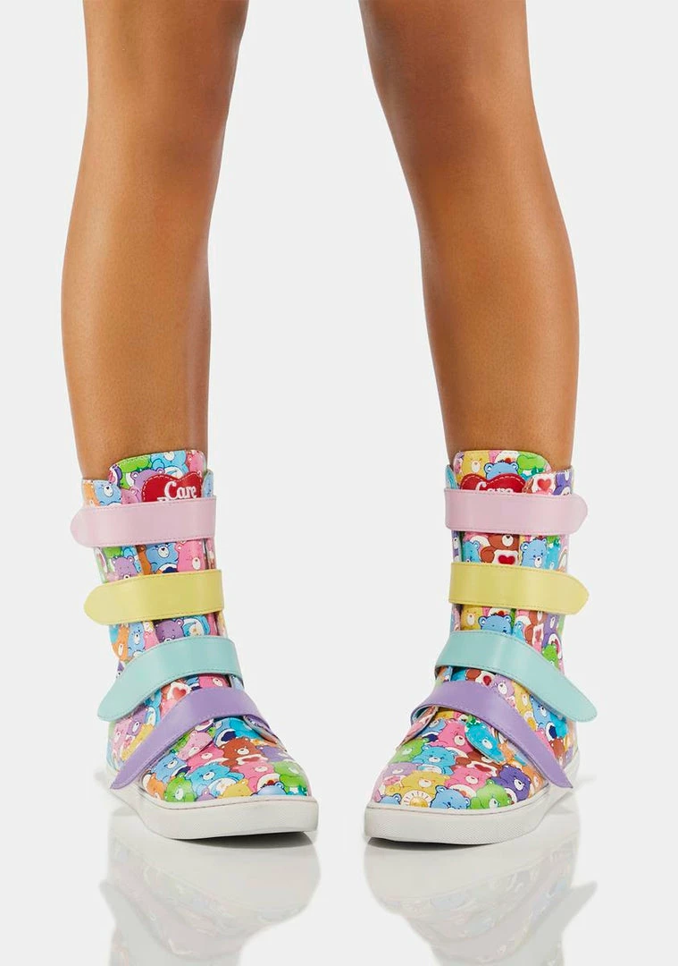 hugs and kisses forever! These high top boots have a vegan leather construction, multicolored velcro strap closures on the front, and a rainbow Care Bears print all over.