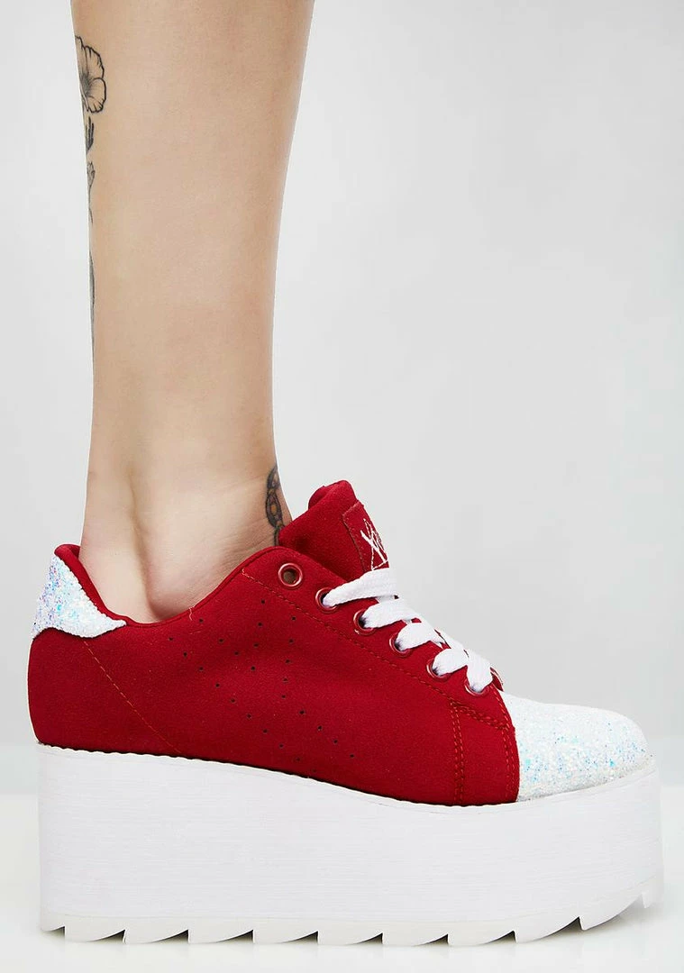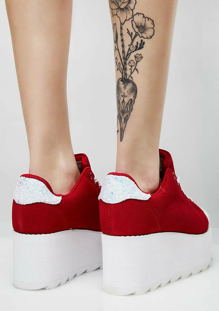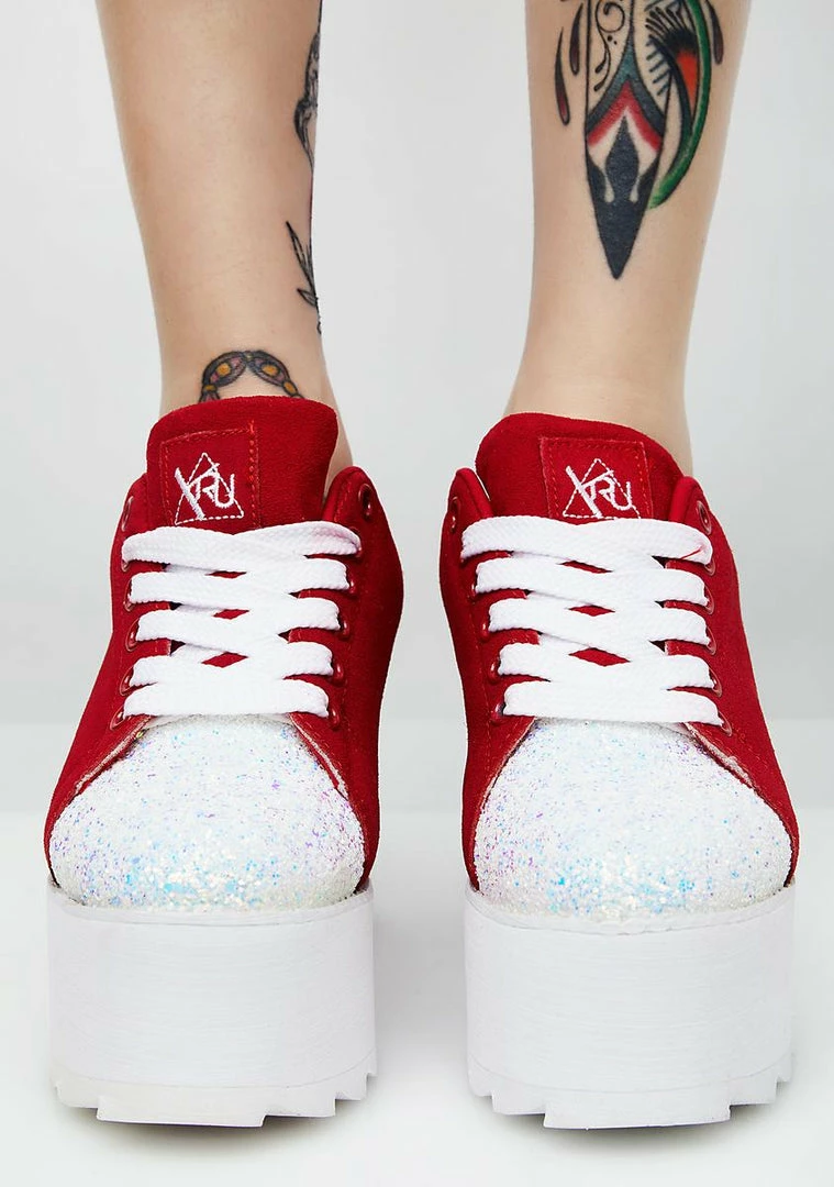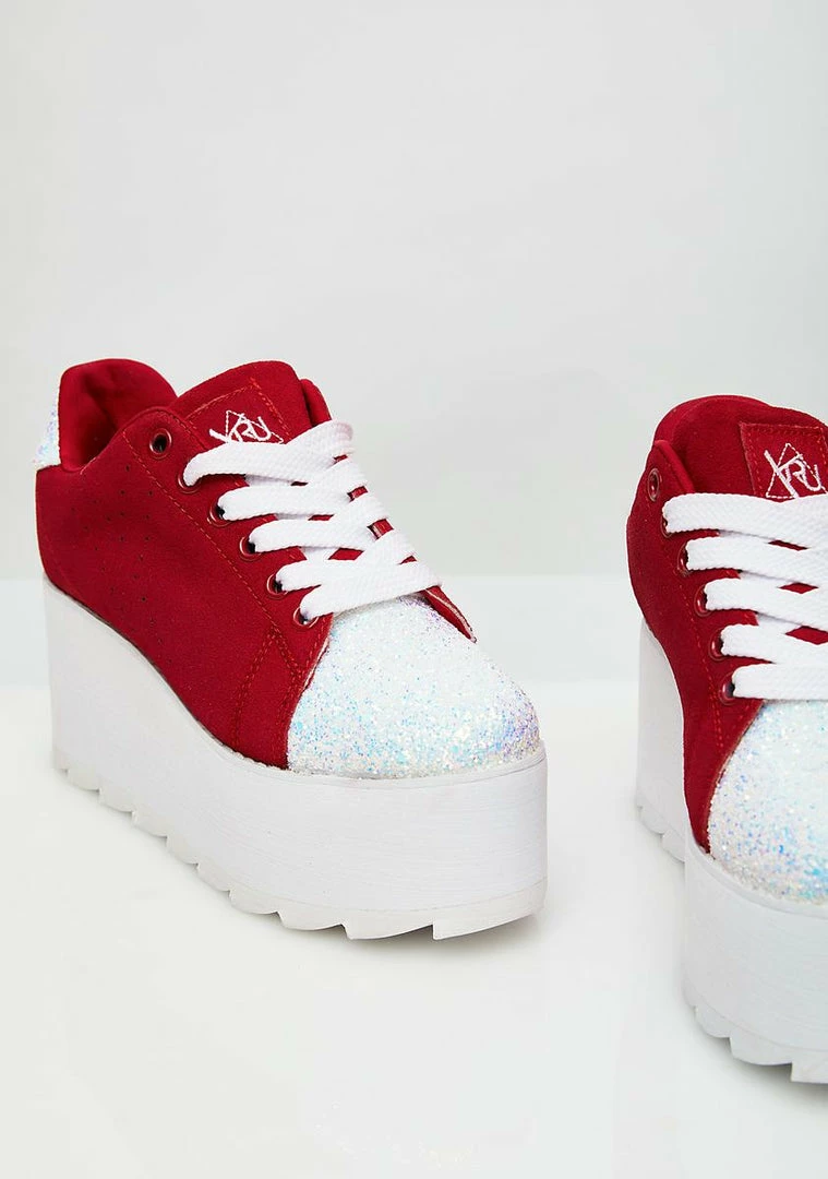 cuz you got luv on the brain. These red sneakers have thikk platform soles, sparkly glitter toes, and lace-up closures.