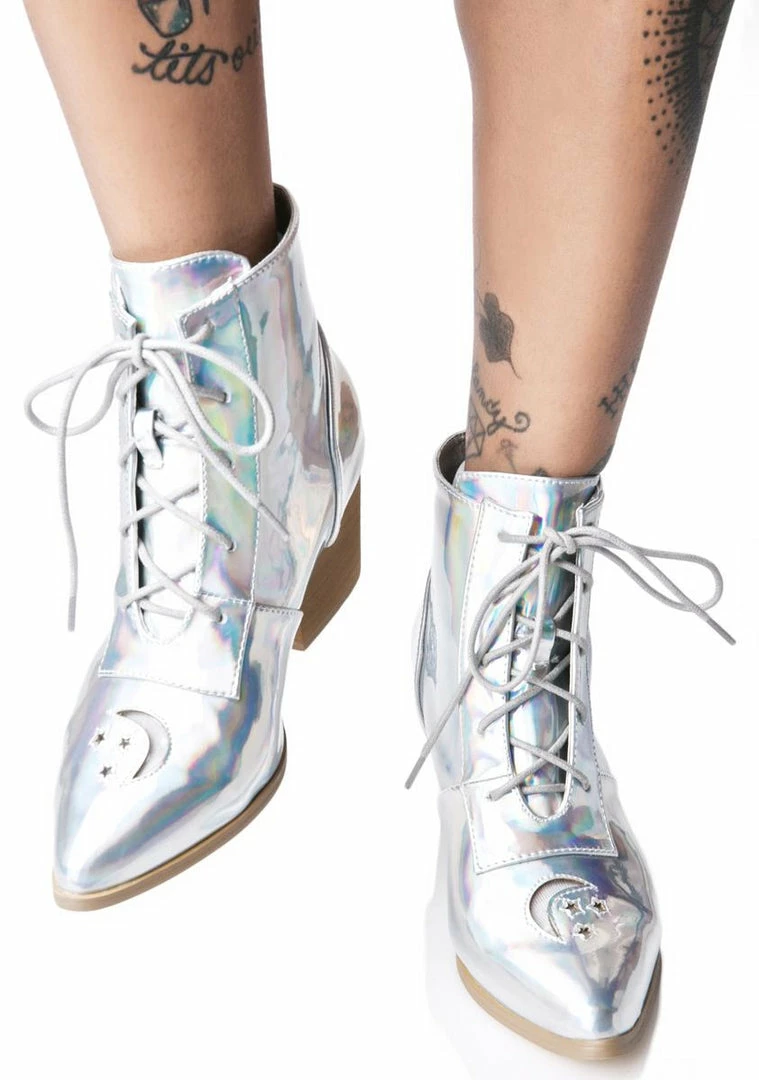 cuz we lurrrvvve you to the moon, stars, and back! These superr sikk boots feature a silver hologram patent upper so iridescent itΓΒs fckknΓΒ femme-tastic. The cut-out moon and star with a clear vinyl overlay at the toe box will catch any eye by their aura. With its light brown heel rubber sole, youΓΒll be a comfy stunna while standing tall. But we all know ya can get down when you lace up its cords. Fer the kittenz who want to take their feet out of this world, strap on these sikk BBz.