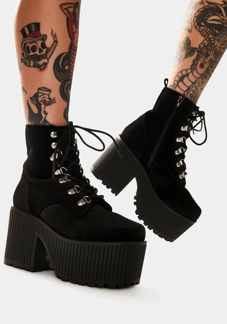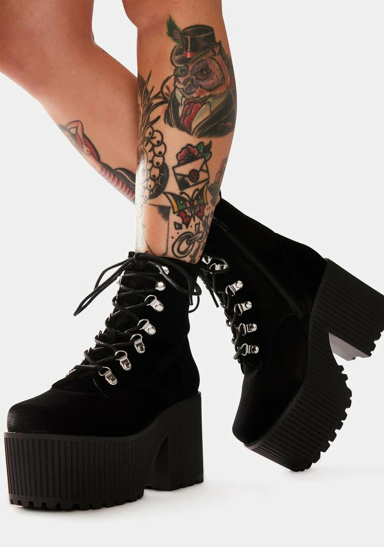 cuz youΓ’ΒΒre a nightcrawler. These platform boots have a velvet upper construction, adjustable D-ring lace-ups, side zip closures, and heeled platform soles with a creeper design.