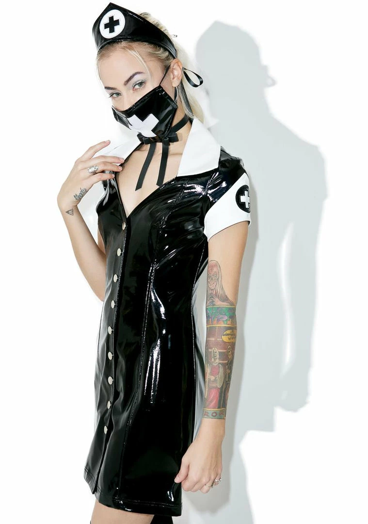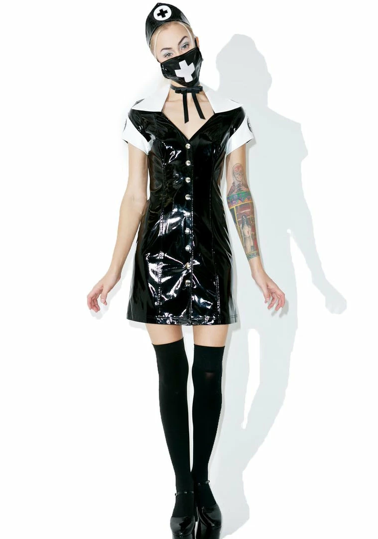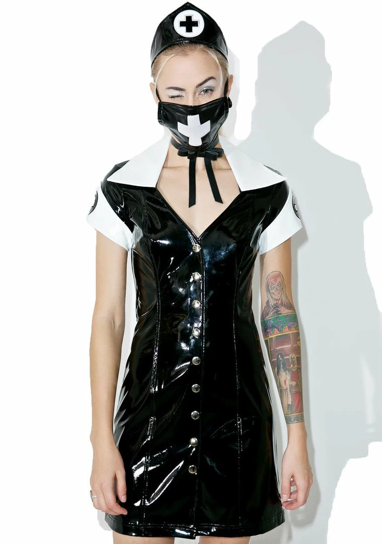 time to take yer medicine, babe~ WeΓ’ΒΒd break a leg just to get treated by ya, so ditch tha scrubs and slip into this mega hott costume set! Features a slick black construction that grips yer curves, contrasting white cuffs Γ’ΒΒN pointed collar, lil first aid graphics on the sleeves, v-neckline, snap button front closures, and matchinΓ’ΒΒ black headpiece with ribbon ties.