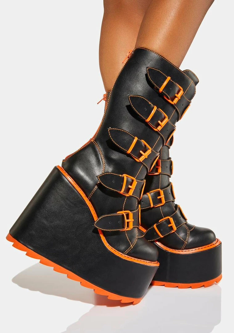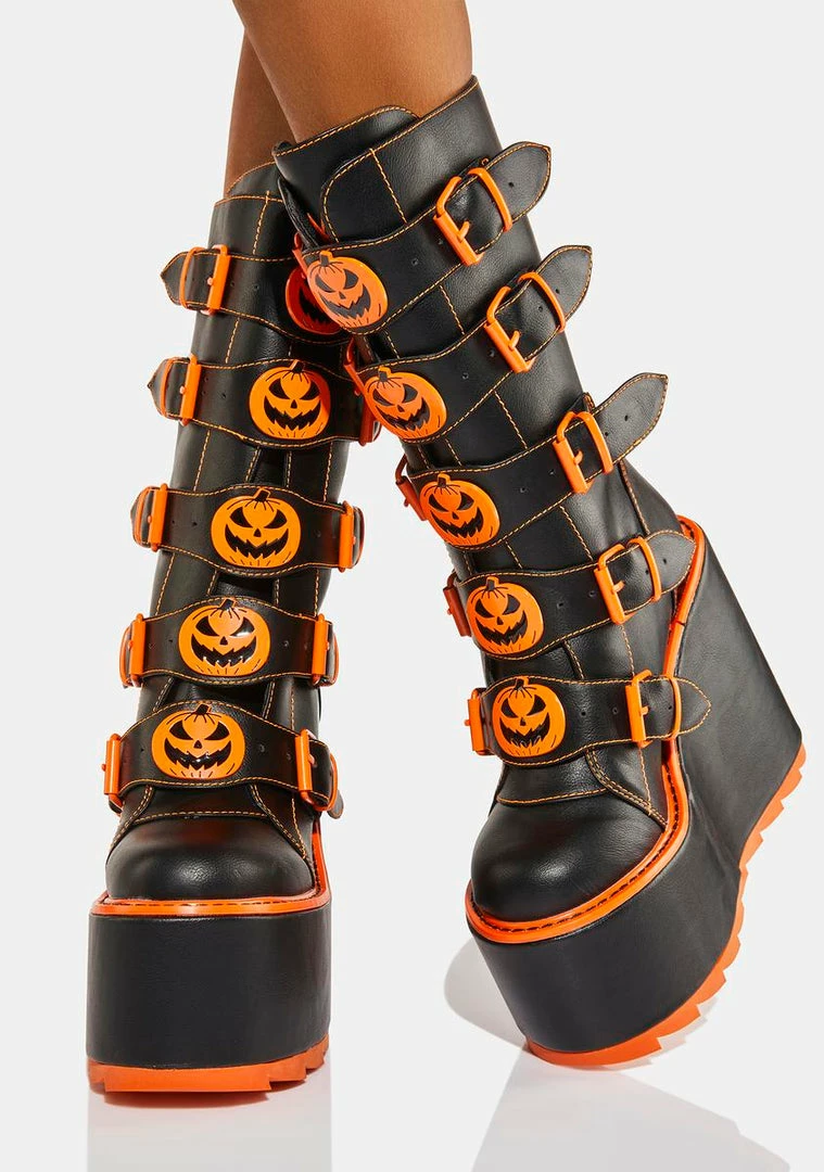cuz you’ll haunt them all year, babe. These wedge platform boots have a vegan leather construction with contrast orange trim, buckle straps on the front with pumpkin enamel charms, and back zip closures.