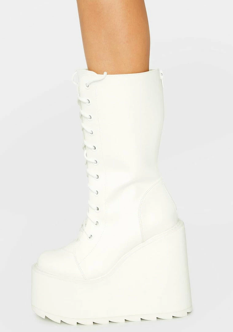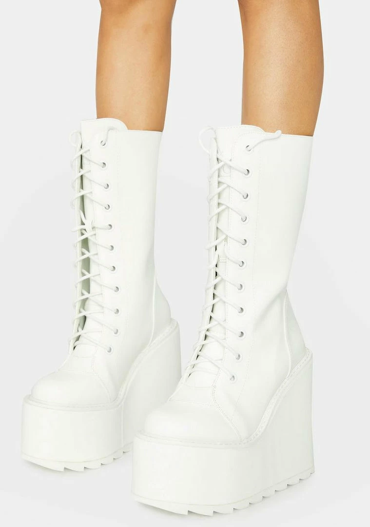 cuz you play by your own rules. These calf-high wedge platform boots have a vegan leather construction, adjustable lace-ups, back zip closures, and chunky treaded soles.