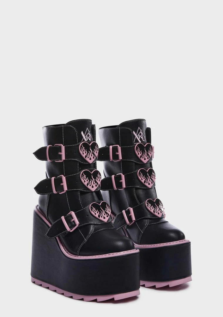 in black vegan leather with contrast pink detailing. Wedge platform soles with rubber treading, adjustable buckle straps with enamel flame hearts, embroidered logos on tongues, and back zip closures.