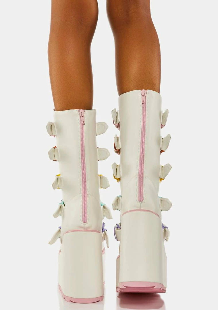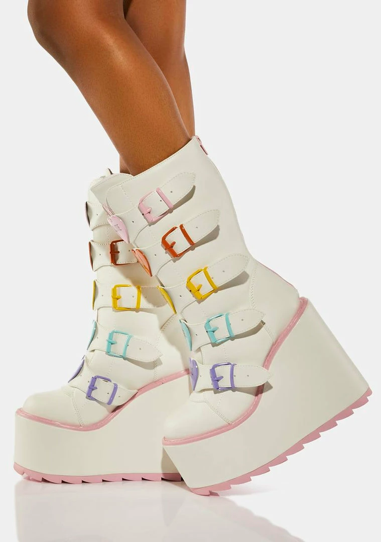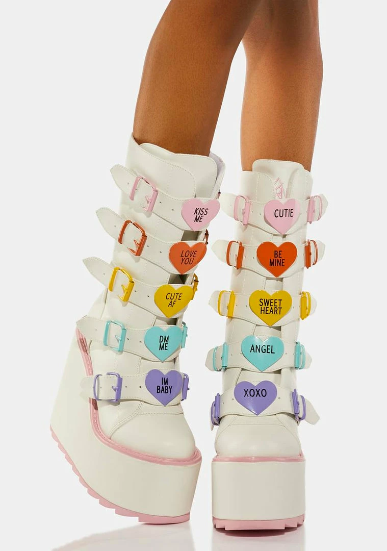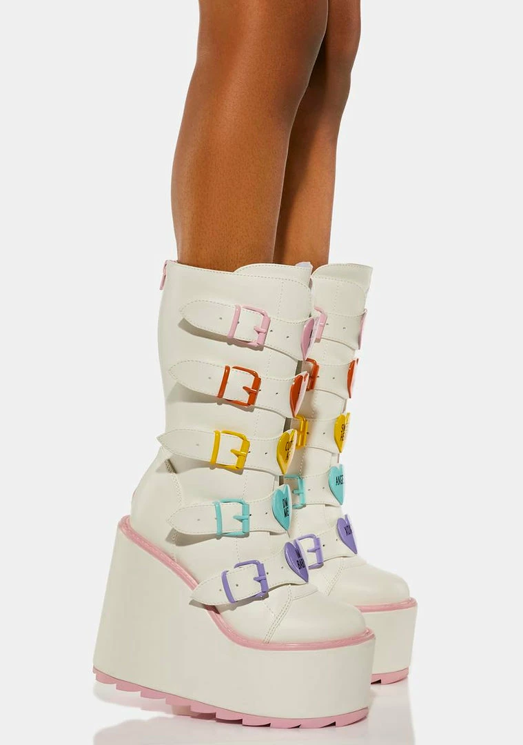 cuz you’ve got a lot of love to give, babe! These wedge platform boots have a vegan leather construction, contrast baby pink trim, adjustable buckle straps with multicolored heart enamel hardware, and back zip closures.