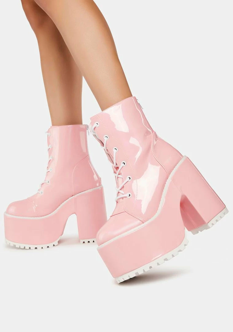 cuz let’s upgrade this party. These boots have a patent vegan leather construction, holographic uppers, enamel eyelets, platform soles, block heels, front lace ups, and a back zip closure.