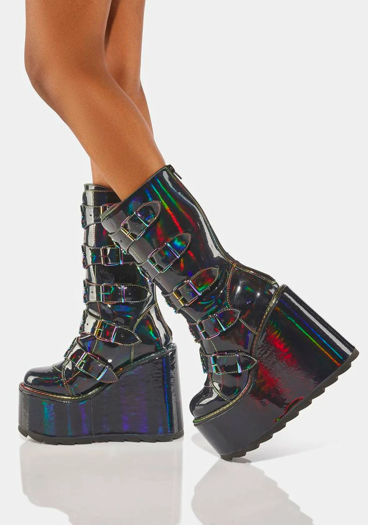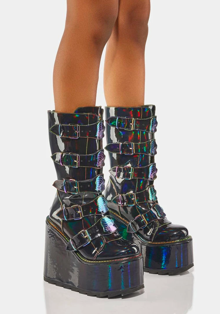 cuz you’re on a trip through wonderland, babe! These holographic calf-high boots have a vegan leather construction, wedge platform soles with rubber cleating, back zip closures, and adjustable buckle straps with mushroom enamel hardware.
