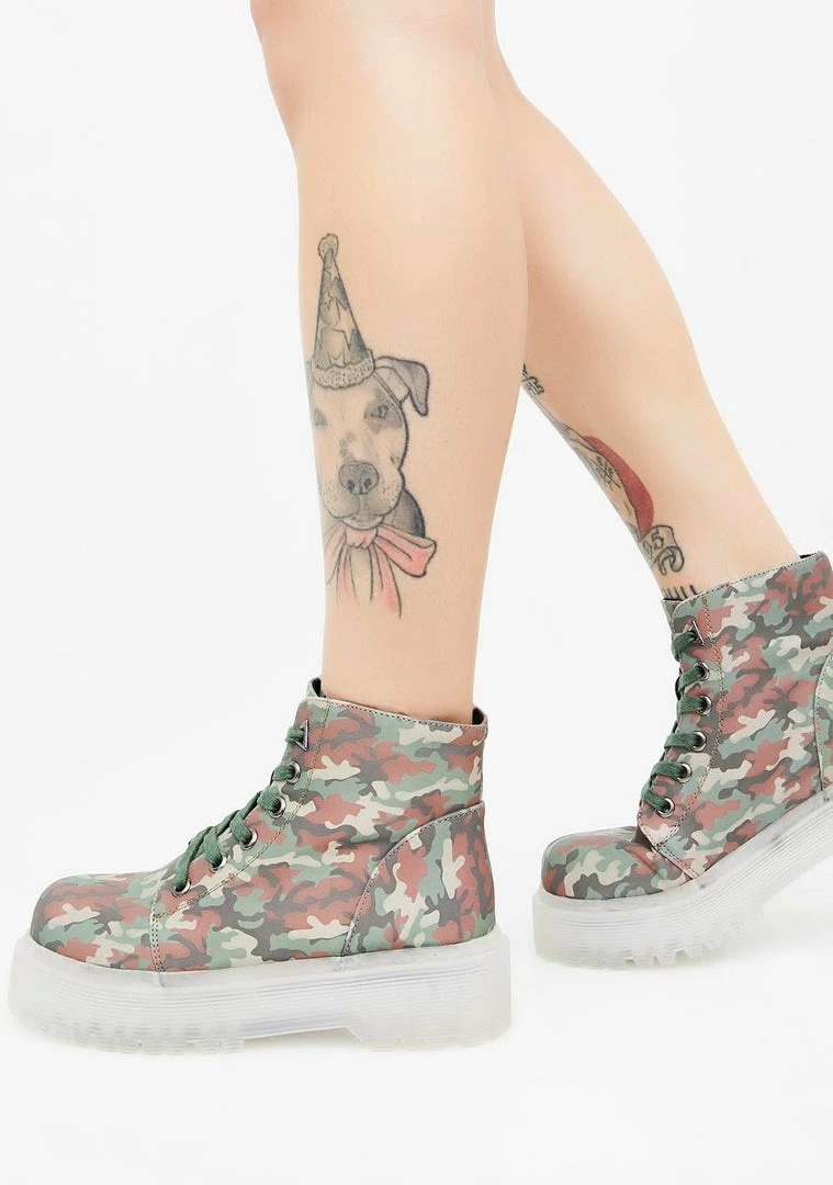 cuz you never hide. These sikk combat boots have a reflective camo print exterior, thikk platform soles, and a lace-up front closure.