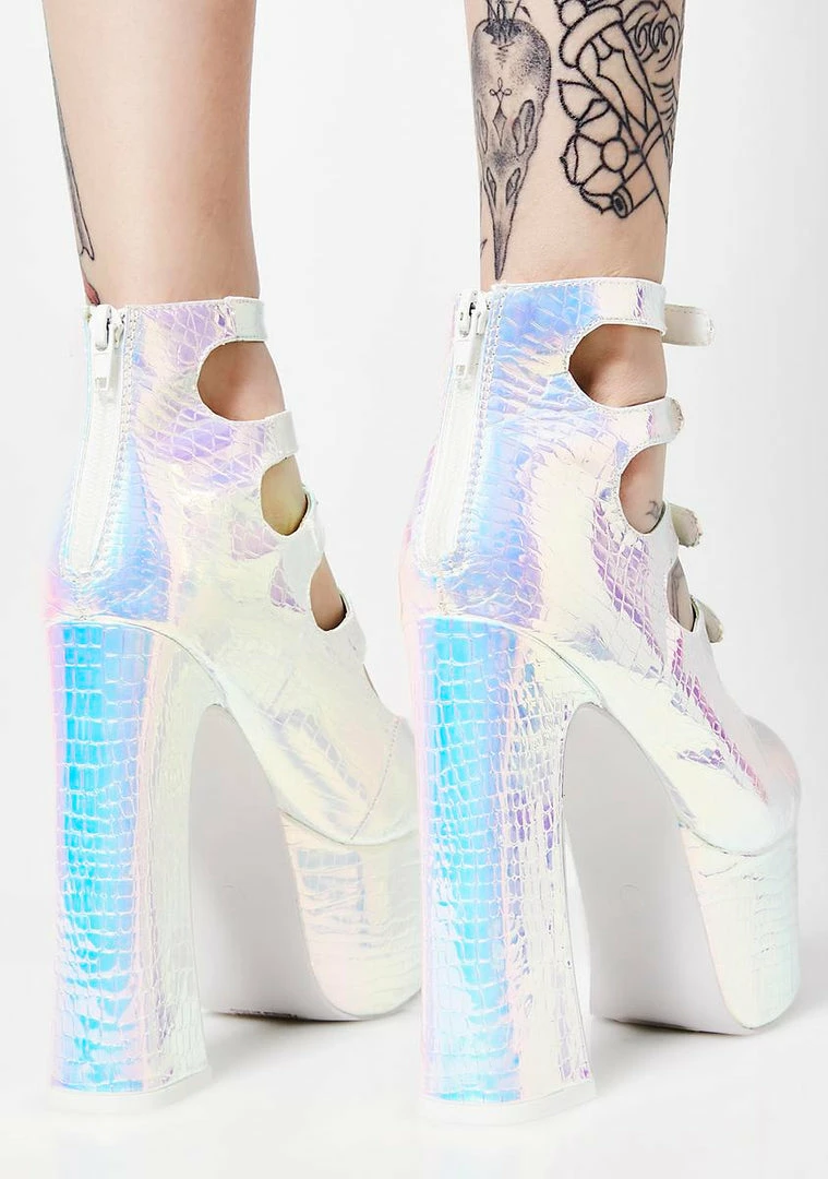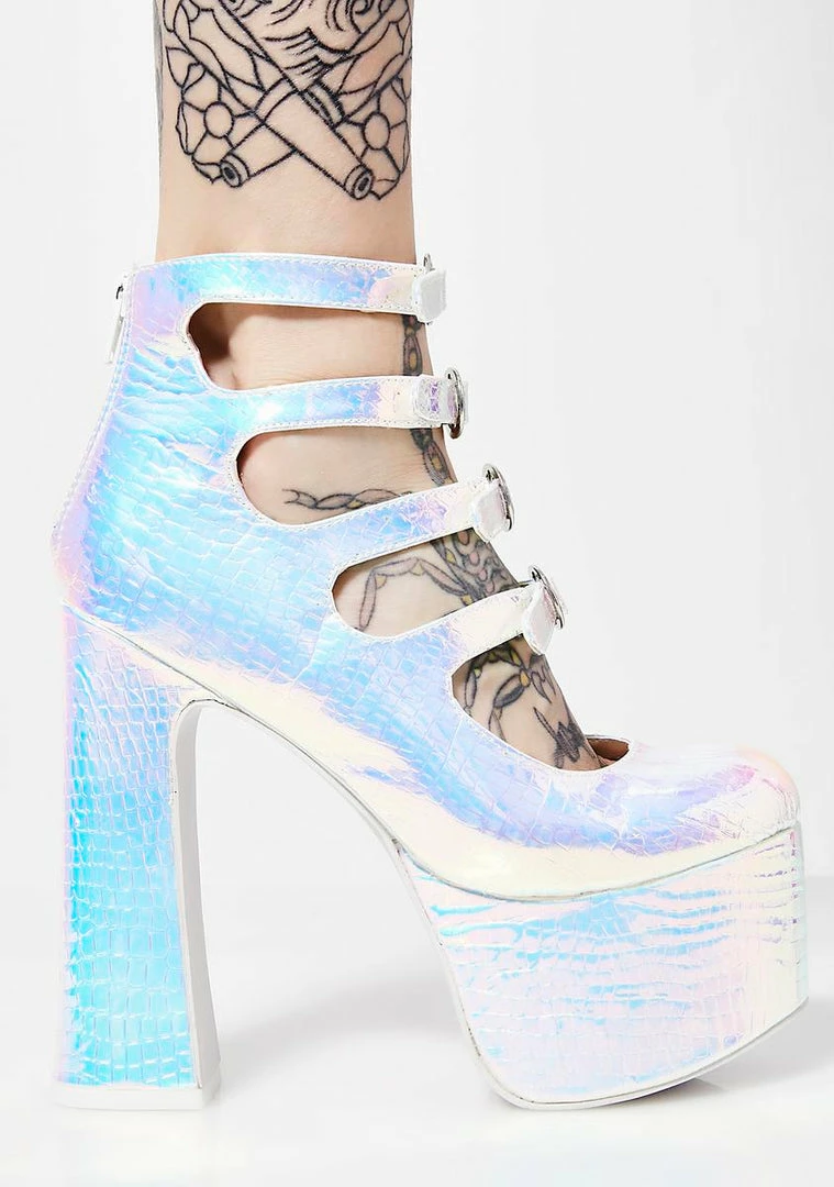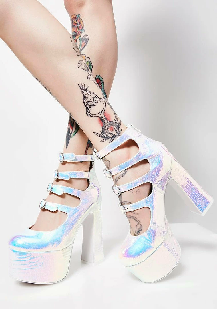 cuz you like to leave emรขยย in the dust. Feel your best with these hologram platforms that have round toes, chunky heels and buckle closures.