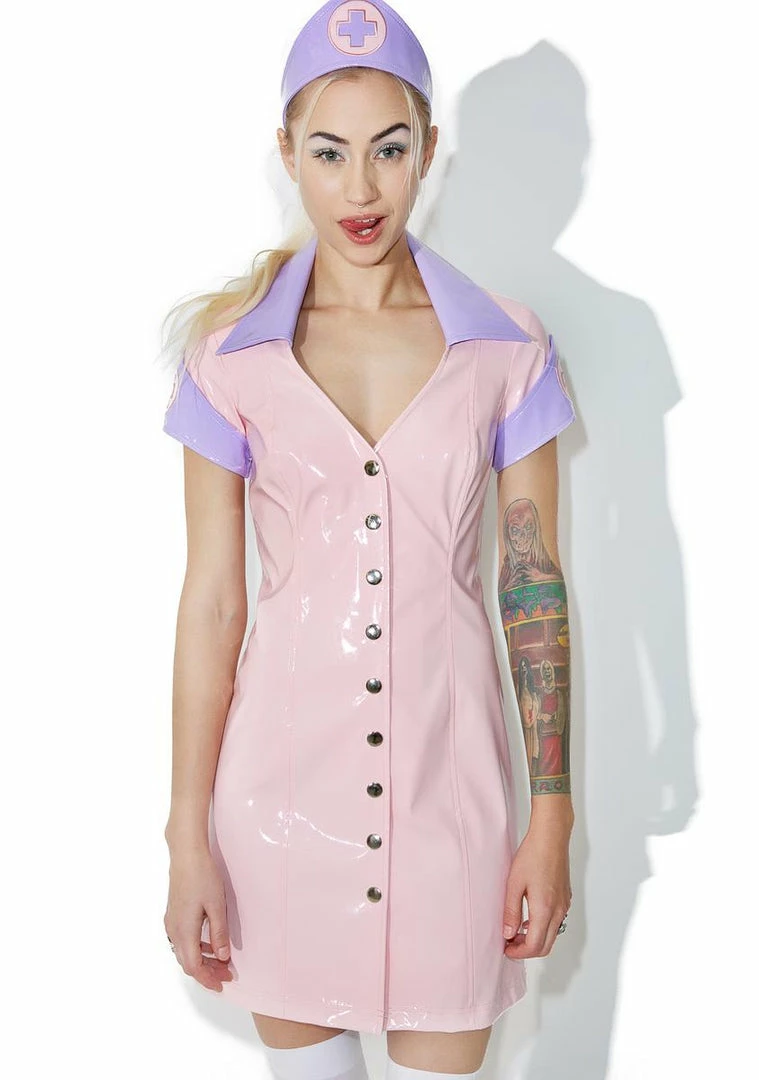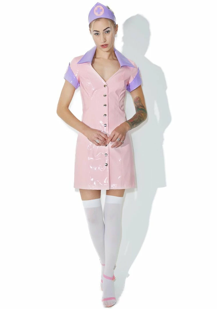 time to take yer medicine, babe~ WeΓ’ΒΒd break a leg just to get treated by ya, so ditch tha scrubs and slip into this mega hott costume set! Features a slick baby pink construction that grips yer curves, contrasting pastel purple cuffs Γ’ΒΒN pointed collar, lil first aid graphics on the sleeves, v-neckline, snap button front closures, and a matchinΓ’ΒΒ purple headpiece with ribbon ties.