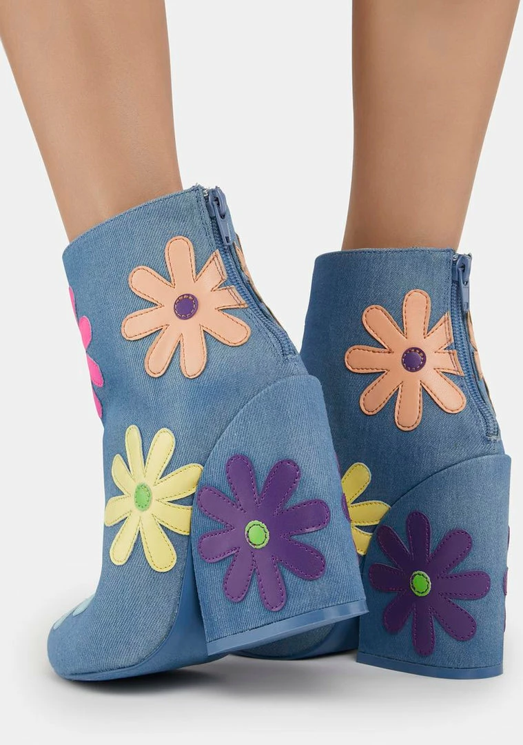 cuz all you need is love. Tap into your inner flower child with these booties that have a denim construction, a pointed toe design, block heels, multi colored vegan leather daisies all over, and a back zipper closure.