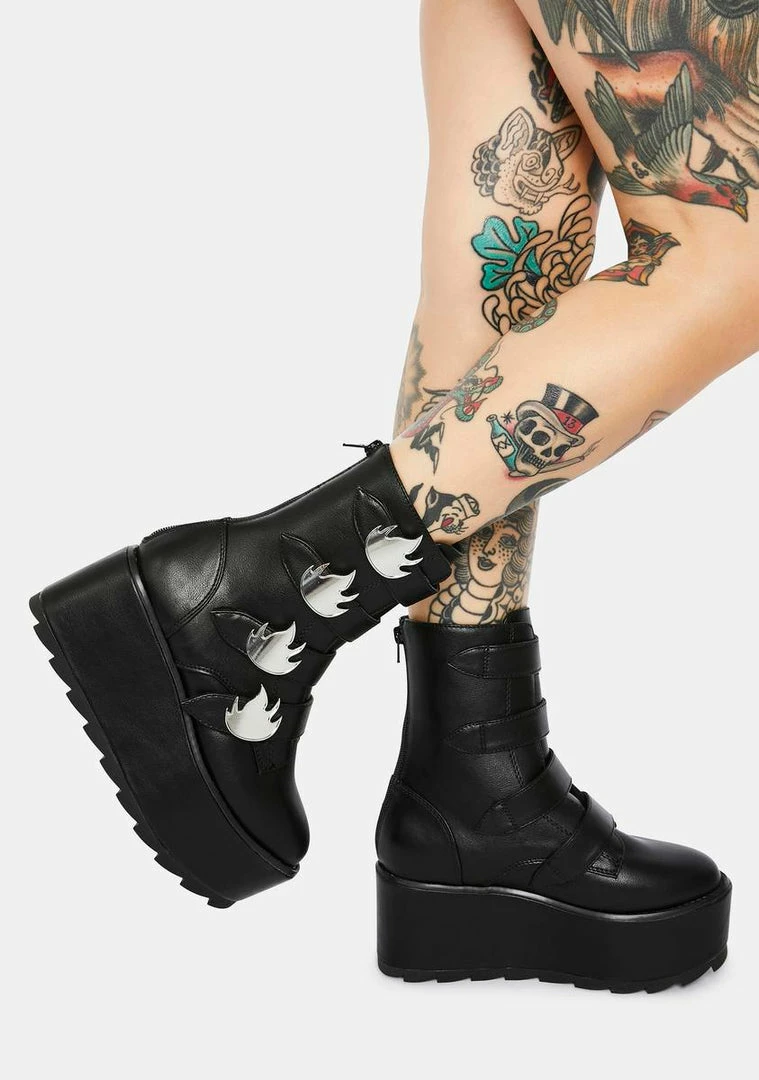 cuz youΓ’ΒΒre too hot to handle. These vegan leather platform boots have back zip closures and adjustable velcro straps with chrome flame hardware.