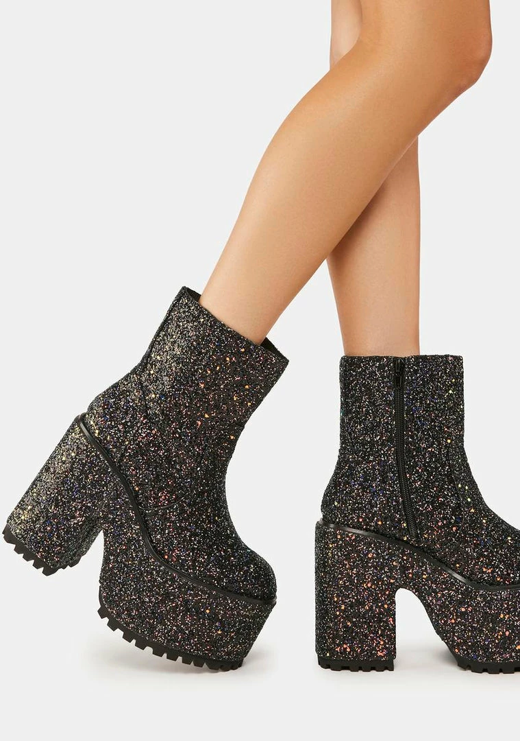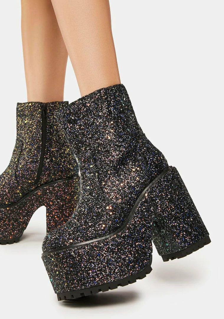 cuz you gotta have that sparkle! These mid-height ankle boots have a vegan leather construction with iridescent glitter all over, chunky platforms with block heels, and side zip closures.