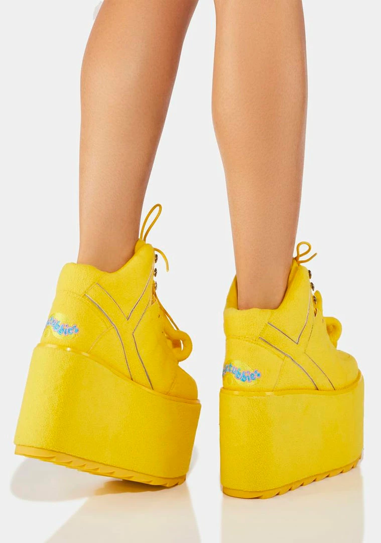 cuz you keep it cute! These Teletubbies platform sneakers have a fuzzy fleece construction, reflective trim, adjustable lace-up closures, padded collars and tongues, Laa Laa antenna details on the toes, rubber treaded outsoles, and logo graphics on the back.