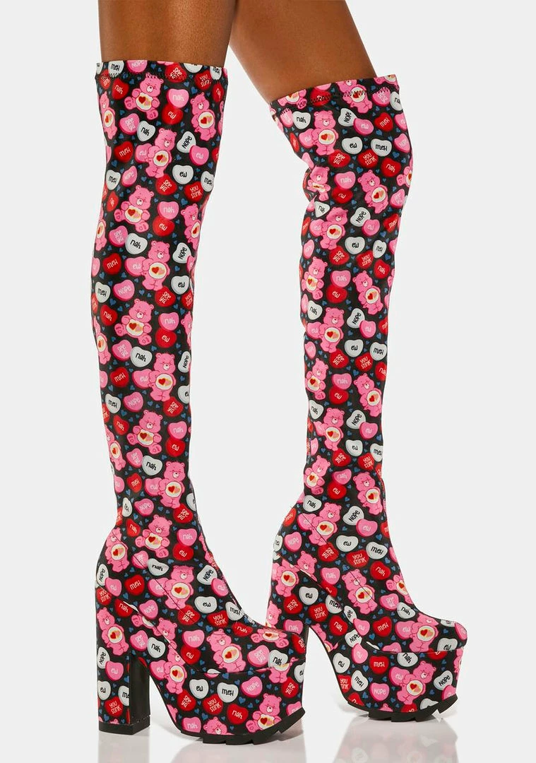cuz you love to love! These stretchy thigh high boots have a spandex construction, chunky platform soles with block heels, rubber cleated outsoles, and a Care Bears print all over with Valentine heart graphics.