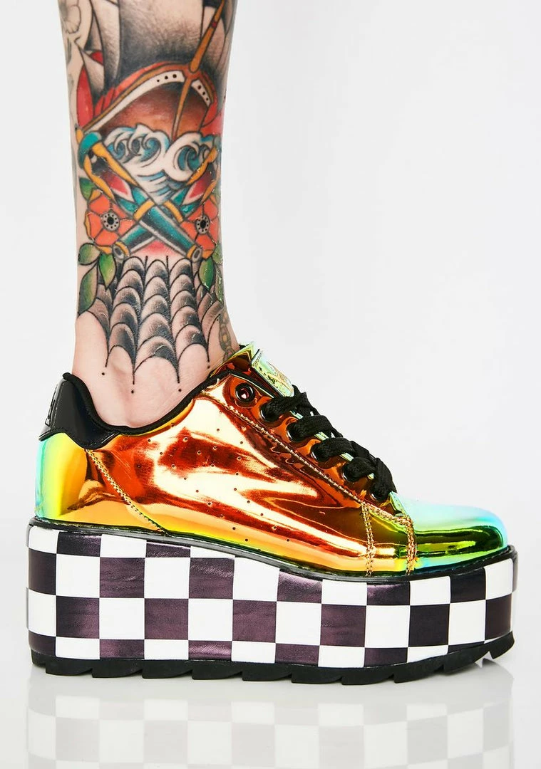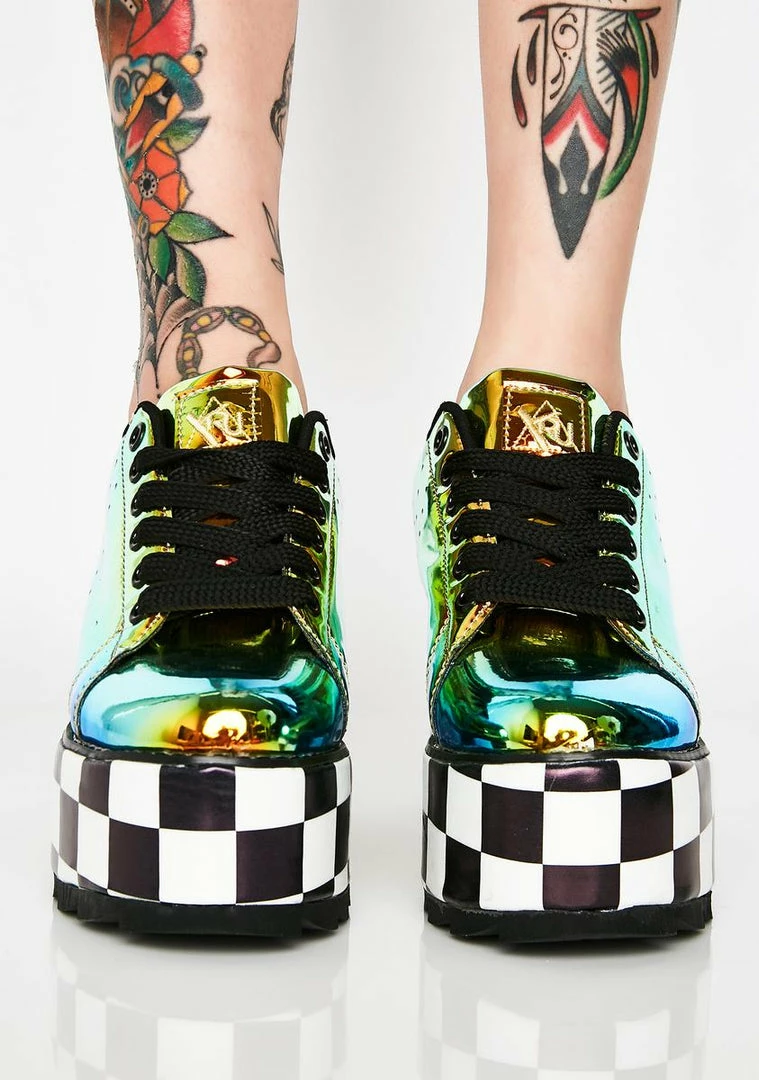 got ya movin at the speed of light! Bring on the intergalactic party in these sikk AF holographic platform sneakers that have checkered platform soles with treaded bottoms, round toes and lace up closures.