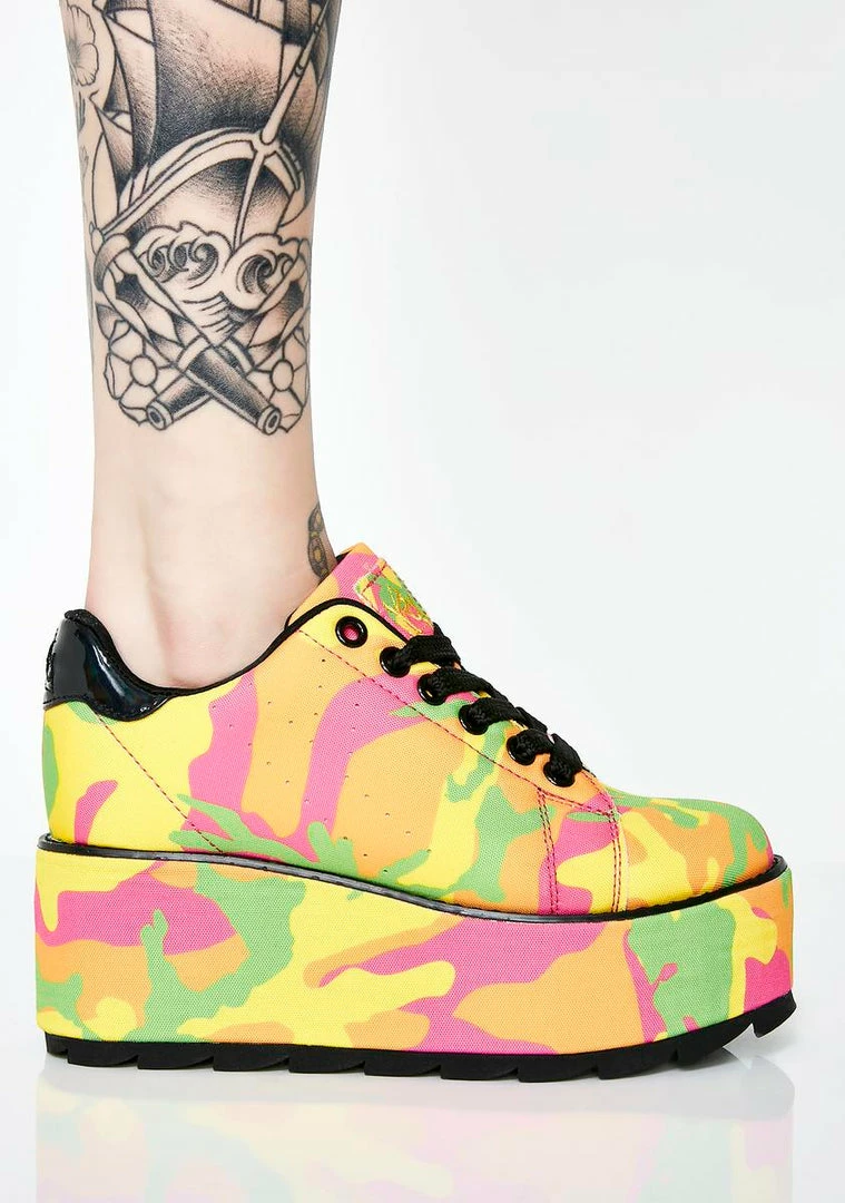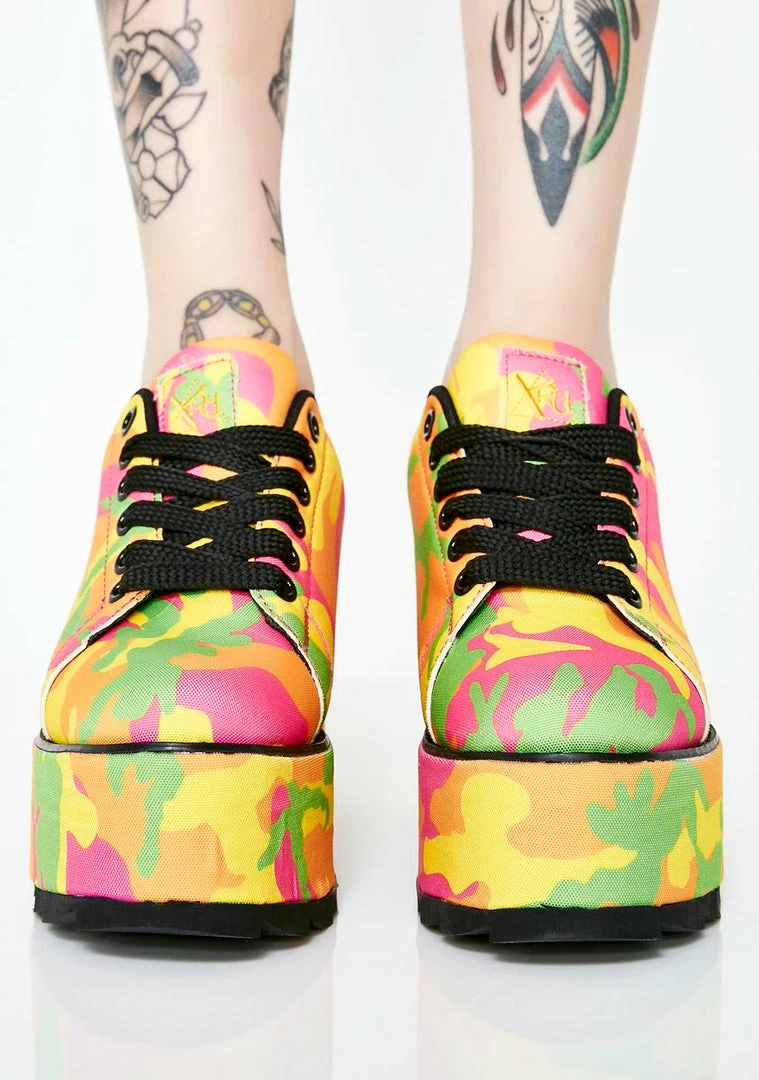 cuz ya run thingz, bb. Own the neon scene in these savage AF camo platforms that lace-up and have rounded toes.