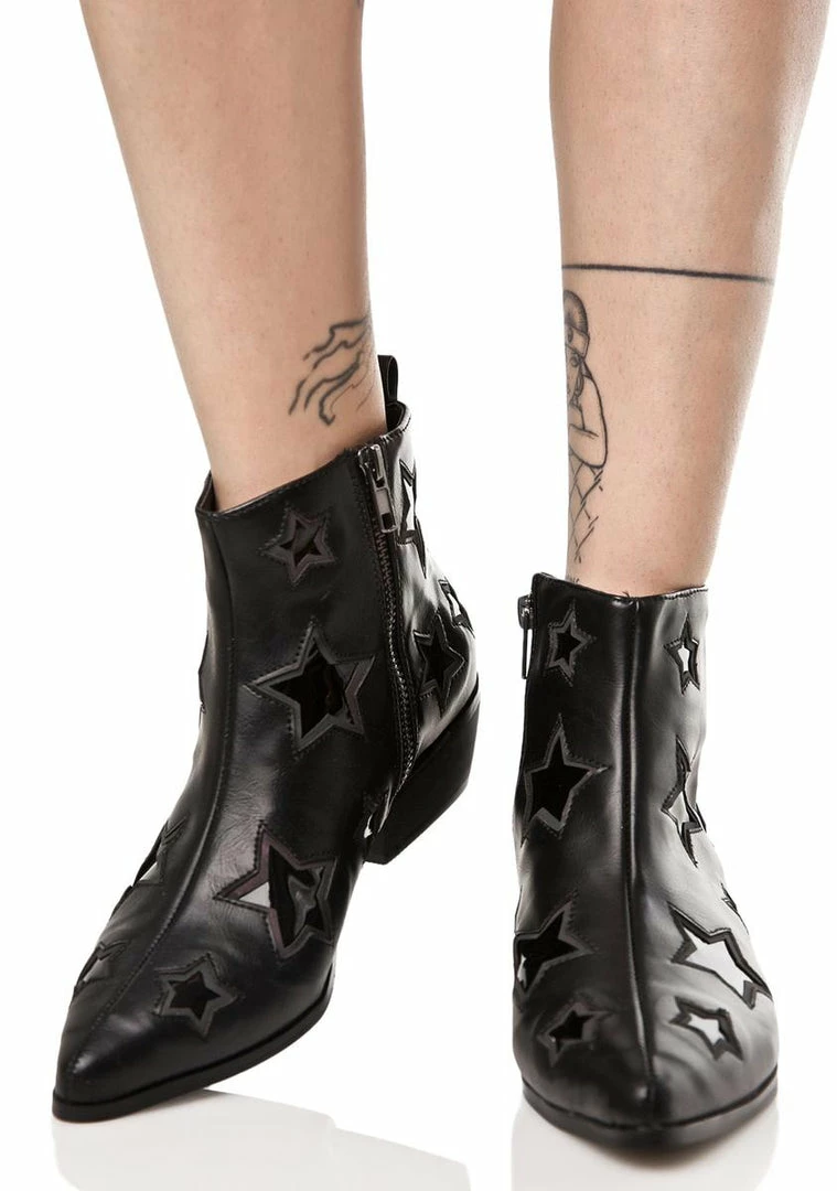 gathers up all tha shooting stars! These super awesome cowgirl style boots feature a black vegan leather upper with cutout stars with 3M reflective borders that shine when that flash hits! With an easy pull on style, side zipper, and 3â wooden heel, this bb is ready to fire da magic away wid a click of the heel.