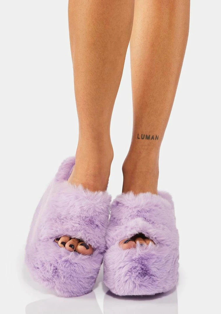 cuz you’re a next level babe. These platform wedge sandals have a faux fur construction, rubber cleated soles, and peep toes.
