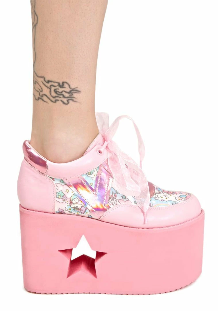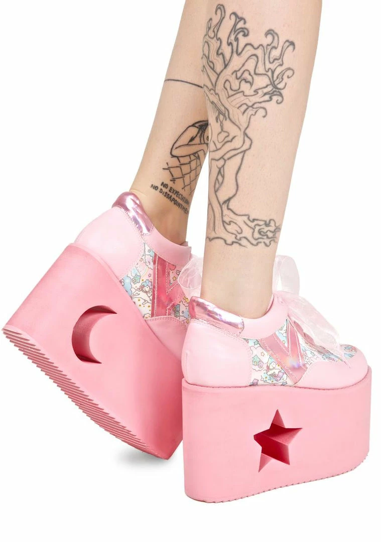 are gonna leave of trail of smiles รขยยn happiness behind ya! These super eXXXclusive bbs are a collab with Y.R.U. and your fav sibling duo, Kiki & Lala! Take a cosmic journey with the Little Twin Stars and their trusty bb unicorn in these ultra adorable platform sneakers, featurinรขยย a pastel pink รขยยn blue pattern of them prancing thru the clouds รขยยn stars with a gorgeous satin finish, baby pink 100% vegan leather construction, holographic pink trim, exxxtra high treaded platforms with star รขยยn crescent moon cutouts, and perfectly pink lace ups~
