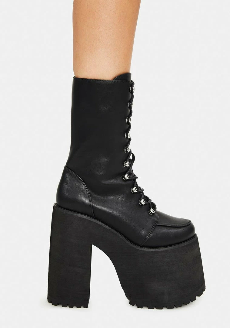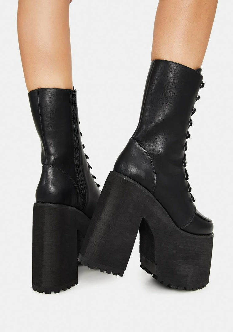 cuz youΓ’ΒΒre next level. These super high platform boots have a vegan leather construction, chunky block heels, adjustable laces with sky hook hardware, and side zip closures.