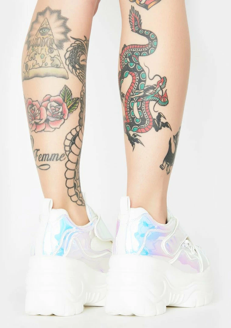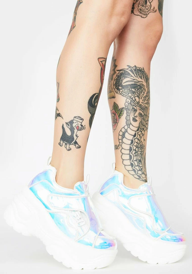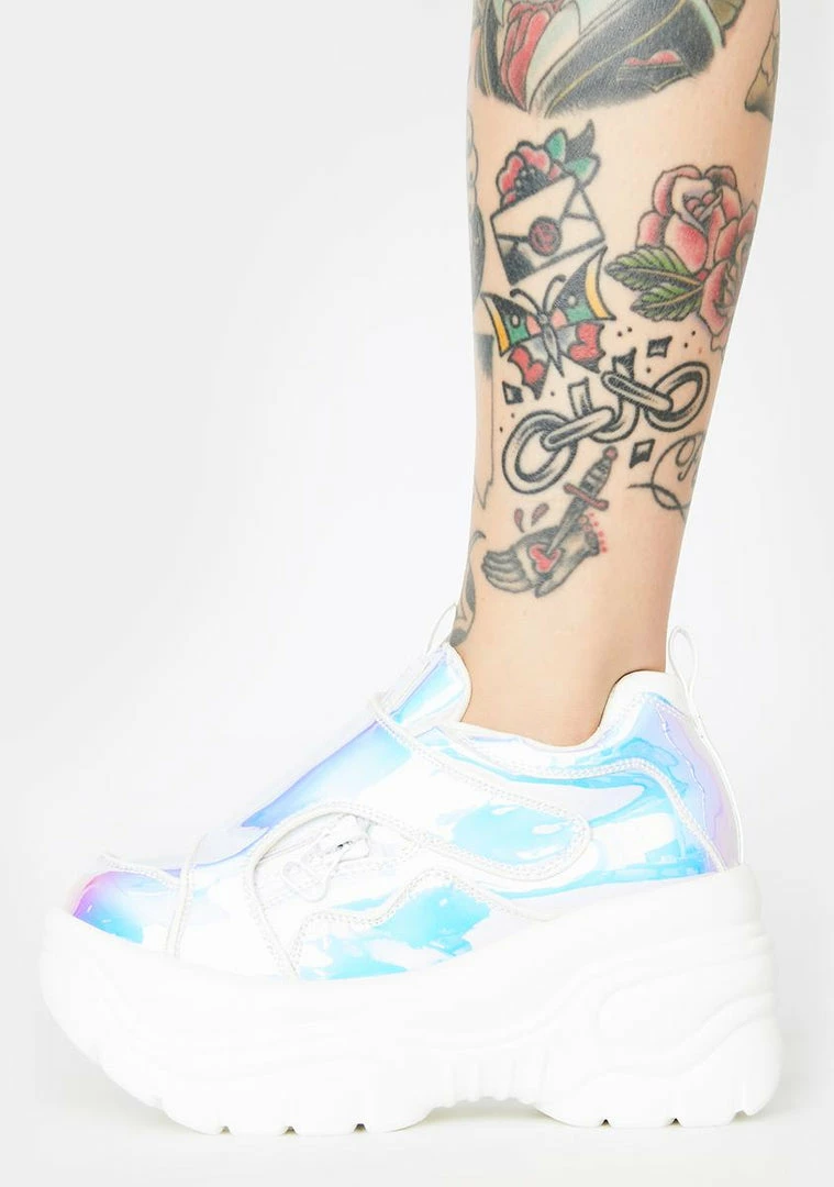 cuz youΓ’ΒΒre takinΓ’ΒΒ a deep dive through the cosmic lights! Kick up stardust in these chunky platform sneakers that have an iridescent vegan leather construction, velcro strap closures NΓ’ΒΒ thick zipper hardware.