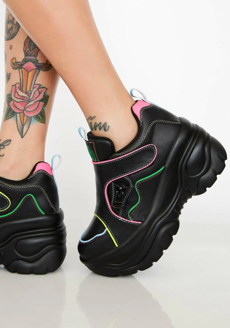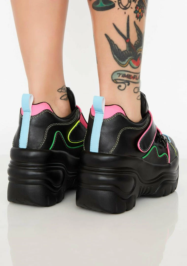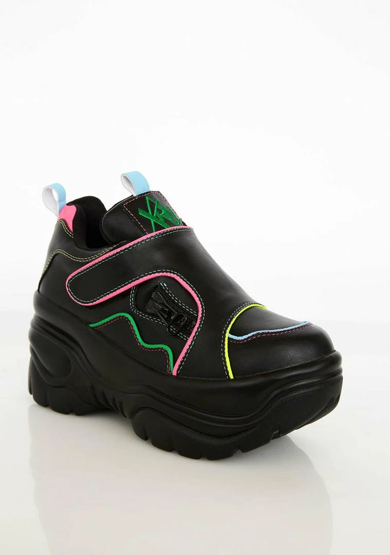 will have ya entering different dimensionz. Choose ya destiny in these chunky reflective platform sneakers that have contrast neon trim, zip hardware, padded linings Nâ velcro closures with elastic gussets.
