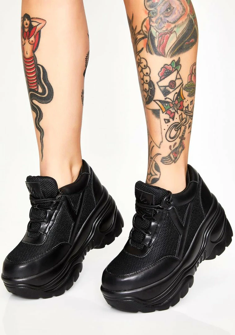 cuz nothing is what it seems. Take the red pill and drop into freaky fierceness with these chunky sneakers that have thicc Nรขยย textured platforms, rounded toes, and lace-up closures.